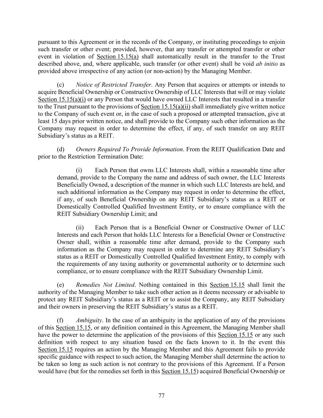 77 pursuant to this Agreement or in the records of the Company, or instituting proceedings to enjoin such transfer or other event; provided, however, that any transfer or attempted transfer or other event in violation of Section 15.15(a) shall automatically result in the transfer to the Trust described above, and, where applicable, such transfer (or other event) shall be void ab initio as provided above irrespective of any action (or non-action) by the Managing Member. (c) Notice of Restricted Transfer. Any Person that acquires or attempts or intends to acquire Beneficial Ownership or Constructive Ownership of LLC Interests that will or may violate Section 15.15(a)(i) or any Person that would have owned LLC Interests that resulted in a transfer to the Trust pursuant to the provisions of Section 15.15(a)(ii) shall immediately give written notice to the Company of such event or, in the case of such a proposed or attempted transaction, give at least 15 days prior written notice, and shall provide to the Company such other information as the Company may request in order to determine the effect, if any, of such transfer on any REIT Subsidiary’s status as a REIT. (d) Owners Required To Provide Information. From the REIT Qualification Date and prior to the Restriction Termination Date: (i) Each Person that owns LLC Interests shall, within a reasonable time after demand, provide to the Company the name and address of such owner, the LLC Interests Beneficially Owned, a description of the manner in which such LLC Interests are held, and such additional information as the Company may request in order to determine the effect, if any, of such Beneficial Ownership on any REIT Subsidiary’s status as a REIT or Domestically Controlled Qualified Investment Entity, or to ensure compliance with the REIT Subsidiary Ownership Limit; and (ii) Each Person that is a Beneficial Owner or Constructive Owner of LLC Interests and each Person that holds LLC Interests for a Beneficial Owner or Constructive Owner shall, within a reasonable time after demand, provide to the Company such information as the Company may request in order to determine any REIT Subsidiary’s status as a REIT or Domestically Controlled Qualified Investment Entity, to comply with the requirements of any taxing authority or governmental authority or to determine such compliance, or to ensure compliance with the REIT Subsidiary Ownership Limit. (e) Remedies Not Limited. Nothing contained in this Section 15.15 shall limit the authority of the Managing Member to take such other action as it deems necessary or advisable to protect any REIT Subsidiary’s status as a REIT or to assist the Company, any REIT Subsidiary and their owners in preserving the REIT Subsidiary’s status as a REIT. (f) Ambiguity. In the case of an ambiguity in the application of any of the provisions of this Section 15.15, or any definition contained in this Agreement, the Managing Member shall have the power to determine the application of the provisions of this Section 15.15 or any such definition with respect to any situation based on the facts known to it. In the event this Section 15.15 requires an action by the Managing Member and this Agreement fails to provide specific guidance with respect to such action, the Managing Member shall determine the action to be taken so long as such action is not contrary to the provisions of this Agreement. If a Person would have (but for the remedies set forth in this Section 15.15) acquired Beneficial Ownership or