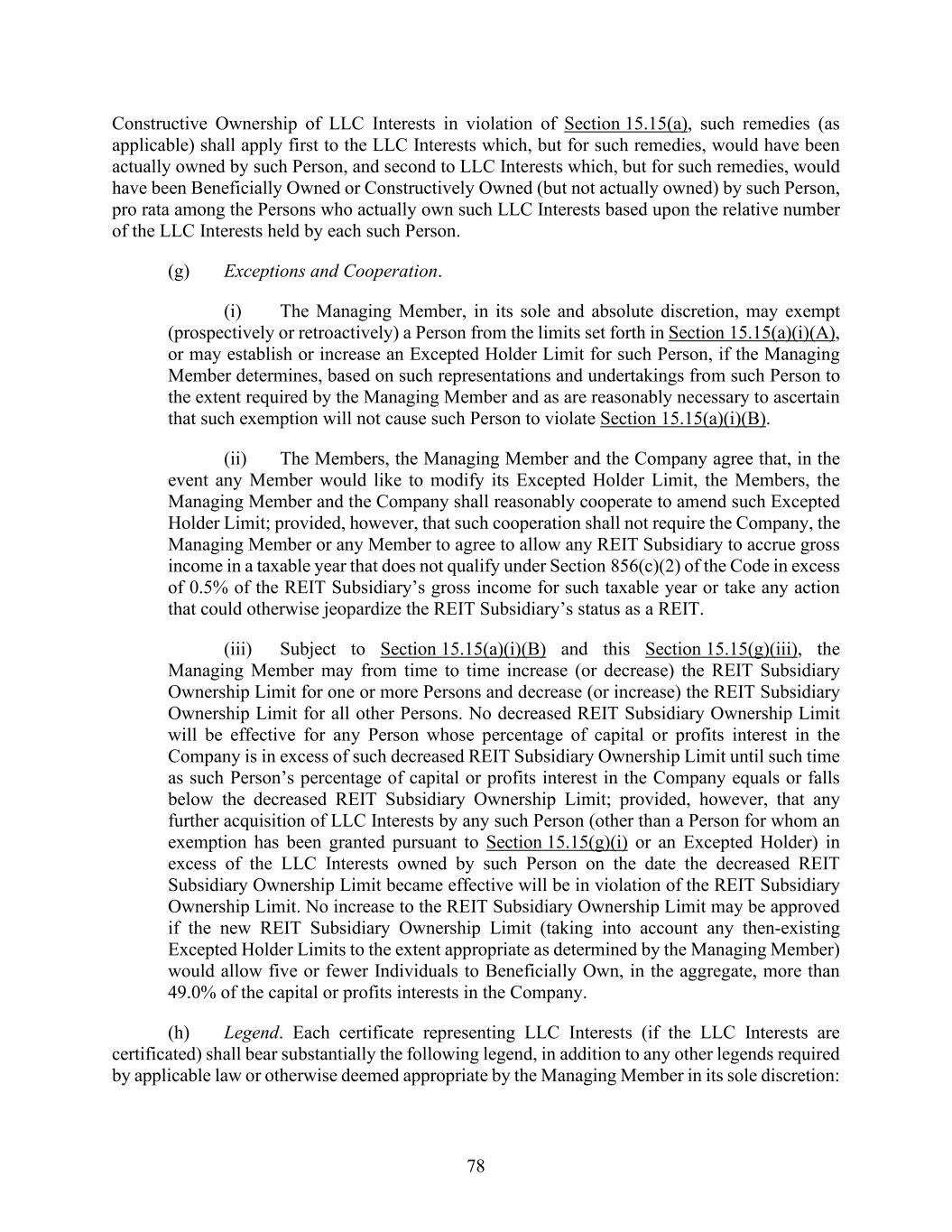 78 Constructive Ownership of LLC Interests in violation of Section 15.15(a), such remedies (as applicable) shall apply first to the LLC Interests which, but for such remedies, would have been actually owned by such Person, and second to LLC Interests which, but for such remedies, would have been Beneficially Owned or Constructively Owned (but not actually owned) by such Person, pro rata among the Persons who actually own such LLC Interests based upon the relative number of the LLC Interests held by each such Person. (g) Exceptions and Cooperation. (i) The Managing Member, in its sole and absolute discretion, may exempt (prospectively or retroactively) a Person from the limits set forth in Section 15.15(a)(i)(A), or may establish or increase an Excepted Holder Limit for such Person, if the Managing Member determines, based on such representations and undertakings from such Person to the extent required by the Managing Member and as are reasonably necessary to ascertain that such exemption will not cause such Person to violate Section 15.15(a)(i)(B). (ii) The Members, the Managing Member and the Company agree that, in the event any Member would like to modify its Excepted Holder Limit, the Members, the Managing Member and the Company shall reasonably cooperate to amend such Excepted Holder Limit; provided, however, that such cooperation shall not require the Company, the Managing Member or any Member to agree to allow any REIT Subsidiary to accrue gross income in a taxable year that does not qualify under Section 856(c)(2) of the Code in excess of 0.5% of the REIT Subsidiary’s gross income for such taxable year or take any action that could otherwise jeopardize the REIT Subsidiary’s status as a REIT. (iii) Subject to Section 15.15(a)(i)(B) and this Section 15.15(g)(iii), the Managing Member may from time to time increase (or decrease) the REIT Subsidiary Ownership Limit for one or more Persons and decrease (or increase) the REIT Subsidiary Ownership Limit for all other Persons. No decreased REIT Subsidiary Ownership Limit will be effective for any Person whose percentage of capital or profits interest in the Company is in excess of such decreased REIT Subsidiary Ownership Limit until such time as such Person’s percentage of capital or profits interest in the Company equals or falls below the decreased REIT Subsidiary Ownership Limit; provided, however, that any further acquisition of LLC Interests by any such Person (other than a Person for whom an exemption has been granted pursuant to Section 15.15(g)(i) or an Excepted Holder) in excess of the LLC Interests owned by such Person on the date the decreased REIT Subsidiary Ownership Limit became effective will be in violation of the REIT Subsidiary Ownership Limit. No increase to the REIT Subsidiary Ownership Limit may be approved if the new REIT Subsidiary Ownership Limit (taking into account any then-existing Excepted Holder Limits to the extent appropriate as determined by the Managing Member) would allow five or fewer Individuals to Beneficially Own, in the aggregate, more than 49.0% of the capital or profits interests in the Company. (h) Legend. Each certificate representing LLC Interests (if the LLC Interests are certificated) shall bear substantially the following legend, in addition to any other legends required by applicable law or otherwise deemed appropriate by the Managing Member in its sole discretion: