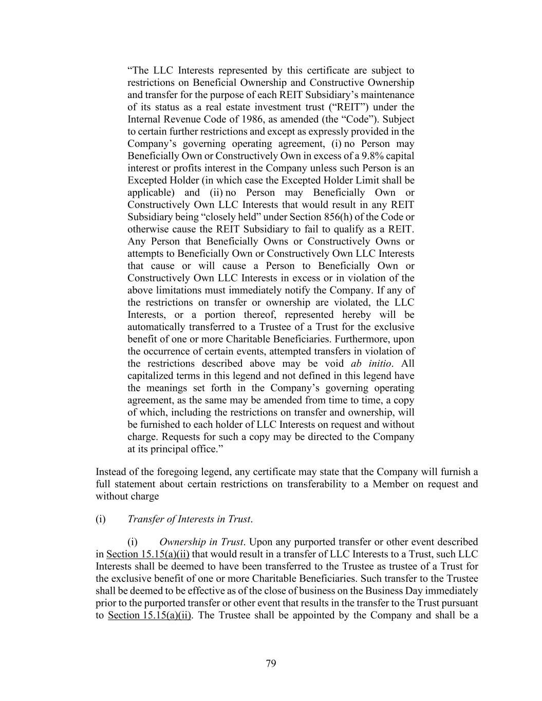 79 “The LLC Interests represented by this certificate are subject to restrictions on Beneficial Ownership and Constructive Ownership and transfer for the purpose of each REIT Subsidiary’s maintenance of its status as a real estate investment trust (“REIT”) under the Internal Revenue Code of 1986, as amended (the “Code”). Subject to certain further restrictions and except as expressly provided in the Company’s governing operating agreement, (i) no Person may Beneficially Own or Constructively Own in excess of a 9.8% capital interest or profits interest in the Company unless such Person is an Excepted Holder (in which case the Excepted Holder Limit shall be applicable) and (ii) no Person may Beneficially Own or Constructively Own LLC Interests that would result in any REIT Subsidiary being “closely held” under Section 856(h) of the Code or otherwise cause the REIT Subsidiary to fail to qualify as a REIT. Any Person that Beneficially Owns or Constructively Owns or attempts to Beneficially Own or Constructively Own LLC Interests that cause or will cause a Person to Beneficially Own or Constructively Own LLC Interests in excess or in violation of the above limitations must immediately notify the Company. If any of the restrictions on transfer or ownership are violated, the LLC Interests, or a portion thereof, represented hereby will be automatically transferred to a Trustee of a Trust for the exclusive benefit of one or more Charitable Beneficiaries. Furthermore, upon the occurrence of certain events, attempted transfers in violation of the restrictions described above may be void ab initio. All capitalized terms in this legend and not defined in this legend have the meanings set forth in the Company’s governing operating agreement, as the same may be amended from time to time, a copy of which, including the restrictions on transfer and ownership, will be furnished to each holder of LLC Interests on request and without charge. Requests for such a copy may be directed to the Company at its principal office.” Instead of the foregoing legend, any certificate may state that the Company will furnish a full statement about certain restrictions on transferability to a Member on request and without charge (i) Transfer of Interests in Trust. (i) Ownership in Trust. Upon any purported transfer or other event described in Section 15.15(a)(ii) that would result in a transfer of LLC Interests to a Trust, such LLC Interests shall be deemed to have been transferred to the Trustee as trustee of a Trust for the exclusive benefit of one or more Charitable Beneficiaries. Such transfer to the Trustee shall be deemed to be effective as of the close of business on the Business Day immediately prior to the purported transfer or other event that results in the transfer to the Trust pursuant to Section 15.15(a)(ii). The Trustee shall be appointed by the Company and shall be a