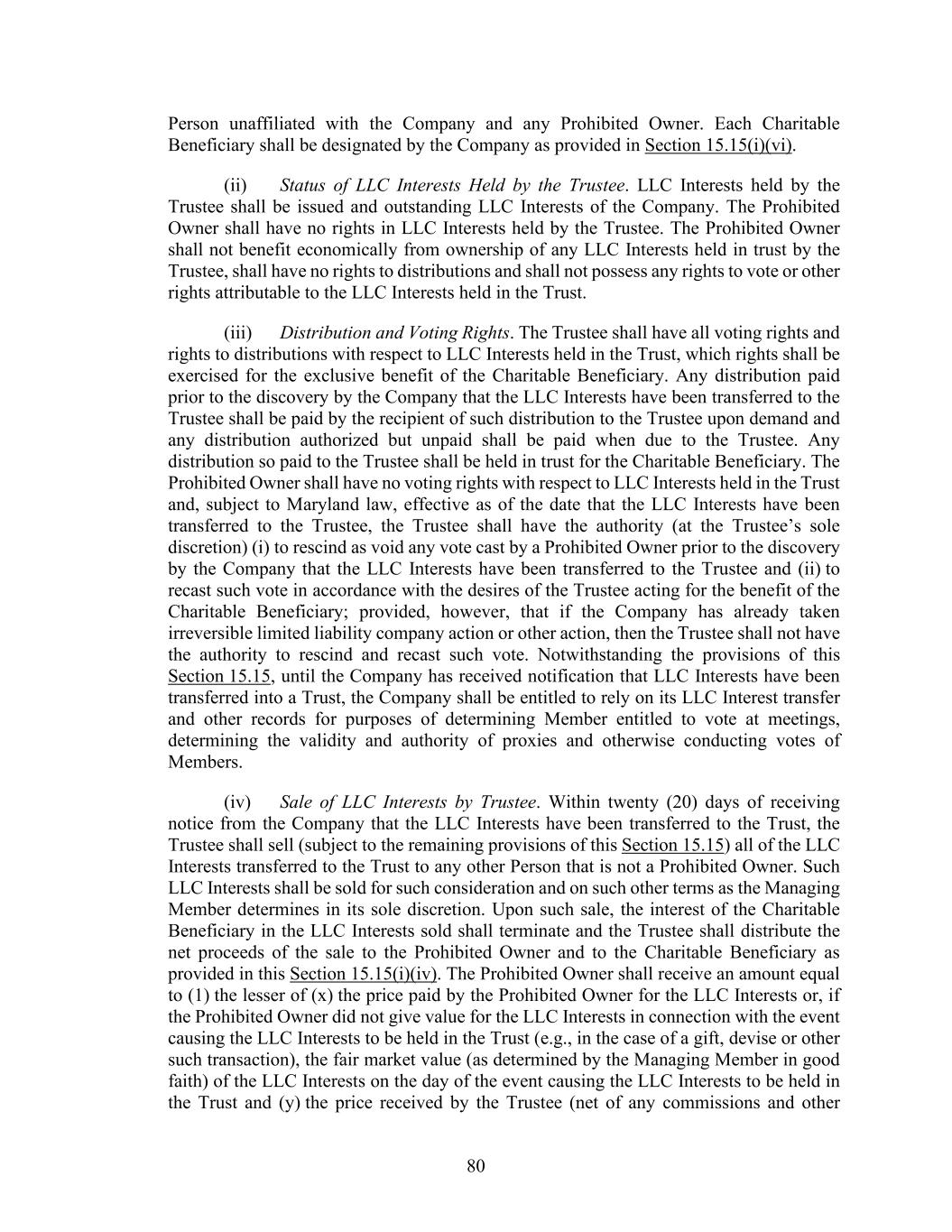 80 Person unaffiliated with the Company and any Prohibited Owner. Each Charitable Beneficiary shall be designated by the Company as provided in Section 15.15(i)(vi). (ii) Status of LLC Interests Held by the Trustee. LLC Interests held by the Trustee shall be issued and outstanding LLC Interests of the Company. The Prohibited Owner shall have no rights in LLC Interests held by the Trustee. The Prohibited Owner shall not benefit economically from ownership of any LLC Interests held in trust by the Trustee, shall have no rights to distributions and shall not possess any rights to vote or other rights attributable to the LLC Interests held in the Trust. (iii) Distribution and Voting Rights. The Trustee shall have all voting rights and rights to distributions with respect to LLC Interests held in the Trust, which rights shall be exercised for the exclusive benefit of the Charitable Beneficiary. Any distribution paid prior to the discovery by the Company that the LLC Interests have been transferred to the Trustee shall be paid by the recipient of such distribution to the Trustee upon demand and any distribution authorized but unpaid shall be paid when due to the Trustee. Any distribution so paid to the Trustee shall be held in trust for the Charitable Beneficiary. The Prohibited Owner shall have no voting rights with respect to LLC Interests held in the Trust and, subject to Maryland law, effective as of the date that the LLC Interests have been transferred to the Trustee, the Trustee shall have the authority (at the Trustee’s sole discretion) (i) to rescind as void any vote cast by a Prohibited Owner prior to the discovery by the Company that the LLC Interests have been transferred to the Trustee and (ii) to recast such vote in accordance with the desires of the Trustee acting for the benefit of the Charitable Beneficiary; provided, however, that if the Company has already taken irreversible limited liability company action or other action, then the Trustee shall not have the authority to rescind and recast such vote. Notwithstanding the provisions of this Section 15.15, until the Company has received notification that LLC Interests have been transferred into a Trust, the Company shall be entitled to rely on its LLC Interest transfer and other records for purposes of determining Member entitled to vote at meetings, determining the validity and authority of proxies and otherwise conducting votes of Members. (iv) Sale of LLC Interests by Trustee. Within twenty (20) days of receiving notice from the Company that the LLC Interests have been transferred to the Trust, the Trustee shall sell (subject to the remaining provisions of this Section 15.15) all of the LLC Interests transferred to the Trust to any other Person that is not a Prohibited Owner. Such LLC Interests shall be sold for such consideration and on such other terms as the Managing Member determines in its sole discretion. Upon such sale, the interest of the Charitable Beneficiary in the LLC Interests sold shall terminate and the Trustee shall distribute the net proceeds of the sale to the Prohibited Owner and to the Charitable Beneficiary as provided in this Section 15.15(i)(iv). The Prohibited Owner shall receive an amount equal to (1) the lesser of (x) the price paid by the Prohibited Owner for the LLC Interests or, if the Prohibited Owner did not give value for the LLC Interests in connection with the event causing the LLC Interests to be held in the Trust (e.g., in the case of a gift, devise or other such transaction), the fair market value (as determined by the Managing Member in good faith) of the LLC Interests on the day of the event causing the LLC Interests to be held in the Trust and (y) the price received by the Trustee (net of any commissions and other