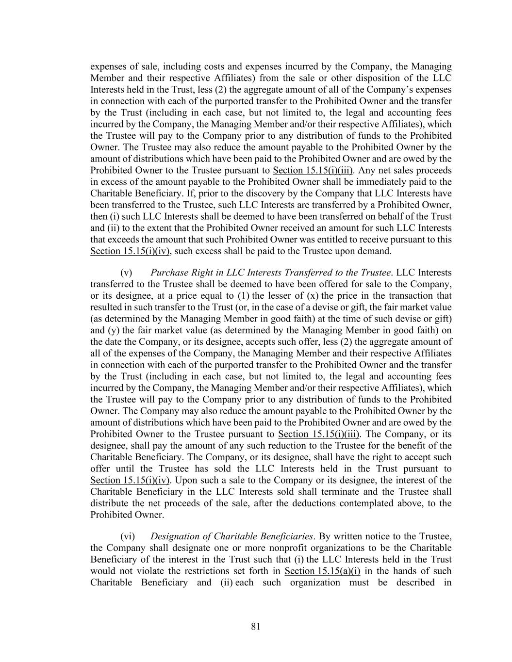 81 expenses of sale, including costs and expenses incurred by the Company, the Managing Member and their respective Affiliates) from the sale or other disposition of the LLC Interests held in the Trust, less (2) the aggregate amount of all of the Company’s expenses in connection with each of the purported transfer to the Prohibited Owner and the transfer by the Trust (including in each case, but not limited to, the legal and accounting fees incurred by the Company, the Managing Member and/or their respective Affiliates), which the Trustee will pay to the Company prior to any distribution of funds to the Prohibited Owner. The Trustee may also reduce the amount payable to the Prohibited Owner by the amount of distributions which have been paid to the Prohibited Owner and are owed by the Prohibited Owner to the Trustee pursuant to Section 15.15(i)(iii). Any net sales proceeds in excess of the amount payable to the Prohibited Owner shall be immediately paid to the Charitable Beneficiary. If, prior to the discovery by the Company that LLC Interests have been transferred to the Trustee, such LLC Interests are transferred by a Prohibited Owner, then (i) such LLC Interests shall be deemed to have been transferred on behalf of the Trust and (ii) to the extent that the Prohibited Owner received an amount for such LLC Interests that exceeds the amount that such Prohibited Owner was entitled to receive pursuant to this Section 15.15(i)(iv), such excess shall be paid to the Trustee upon demand. (v) Purchase Right in LLC Interests Transferred to the Trustee. LLC Interests transferred to the Trustee shall be deemed to have been offered for sale to the Company, or its designee, at a price equal to (1) the lesser of (x) the price in the transaction that resulted in such transfer to the Trust (or, in the case of a devise or gift, the fair market value (as determined by the Managing Member in good faith) at the time of such devise or gift) and (y) the fair market value (as determined by the Managing Member in good faith) on the date the Company, or its designee, accepts such offer, less (2) the aggregate amount of all of the expenses of the Company, the Managing Member and their respective Affiliates in connection with each of the purported transfer to the Prohibited Owner and the transfer by the Trust (including in each case, but not limited to, the legal and accounting fees incurred by the Company, the Managing Member and/or their respective Affiliates), which the Trustee will pay to the Company prior to any distribution of funds to the Prohibited Owner. The Company may also reduce the amount payable to the Prohibited Owner by the amount of distributions which have been paid to the Prohibited Owner and are owed by the Prohibited Owner to the Trustee pursuant to Section 15.15(i)(iii). The Company, or its designee, shall pay the amount of any such reduction to the Trustee for the benefit of the Charitable Beneficiary. The Company, or its designee, shall have the right to accept such offer until the Trustee has sold the LLC Interests held in the Trust pursuant to Section 15.15(i)(iv). Upon such a sale to the Company or its designee, the interest of the Charitable Beneficiary in the LLC Interests sold shall terminate and the Trustee shall distribute the net proceeds of the sale, after the deductions contemplated above, to the Prohibited Owner. (vi) Designation of Charitable Beneficiaries. By written notice to the Trustee, the Company shall designate one or more nonprofit organizations to be the Charitable Beneficiary of the interest in the Trust such that (i) the LLC Interests held in the Trust would not violate the restrictions set forth in Section 15.15(a)(i) in the hands of such Charitable Beneficiary and (ii) each such organization must be described in