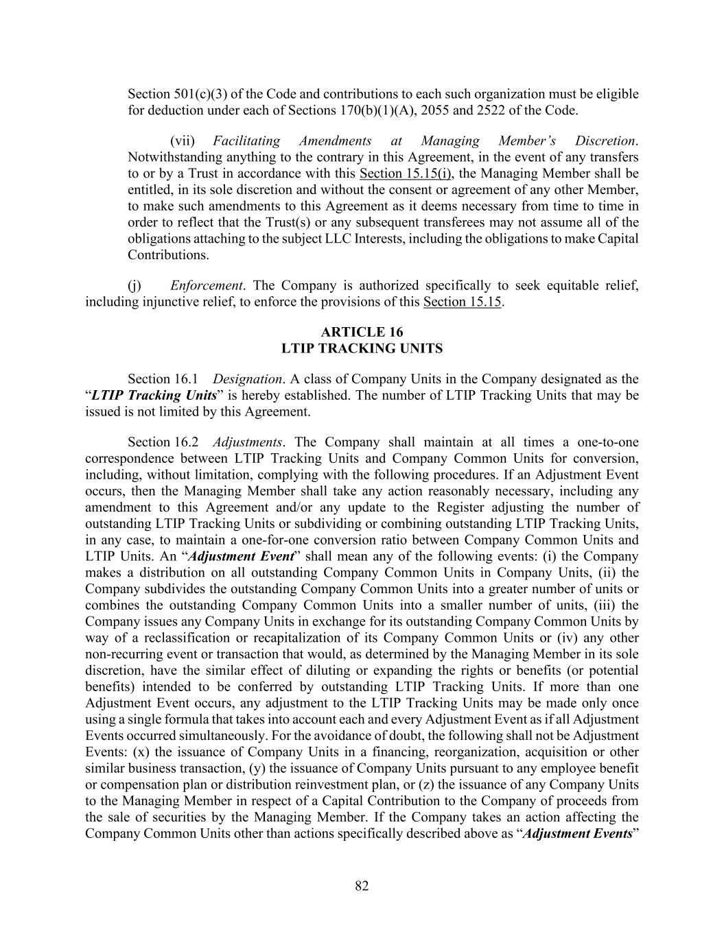 82 Section 501(c)(3) of the Code and contributions to each such organization must be eligible for deduction under each of Sections 170(b)(1)(A), 2055 and 2522 of the Code. (vii) Facilitating Amendments at Managing Member’s Discretion. Notwithstanding anything to the contrary in this Agreement, in the event of any transfers to or by a Trust in accordance with this Section 15.15(i), the Managing Member shall be entitled, in its sole discretion and without the consent or agreement of any other Member, to make such amendments to this Agreement as it deems necessary from time to time in order to reflect that the Trust(s) or any subsequent transferees may not assume all of the obligations attaching to the subject LLC Interests, including the obligations to make Capital Contributions. (j) Enforcement. The Company is authorized specifically to seek equitable relief, including injunctive relief, to enforce the provisions of this Section 15.15. ARTICLE 16 LTIP TRACKING UNITS Section 16.1 Designation. A class of Company Units in the Company designated as the “LTIP Tracking Units” is hereby established. The number of LTIP Tracking Units that may be issued is not limited by this Agreement. Section 16.2 Adjustments. The Company shall maintain at all times a one-to-one correspondence between LTIP Tracking Units and Company Common Units for conversion, including, without limitation, complying with the following procedures. If an Adjustment Event occurs, then the Managing Member shall take any action reasonably necessary, including any amendment to this Agreement and/or any update to the Register adjusting the number of outstanding LTIP Tracking Units or subdividing or combining outstanding LTIP Tracking Units, in any case, to maintain a one-for-one conversion ratio between Company Common Units and LTIP Units. An “Adjustment Event” shall mean any of the following events: (i) the Company makes a distribution on all outstanding Company Common Units in Company Units, (ii) the Company subdivides the outstanding Company Common Units into a greater number of units or combines the outstanding Company Common Units into a smaller number of units, (iii) the Company issues any Company Units in exchange for its outstanding Company Common Units by way of a reclassification or recapitalization of its Company Common Units or (iv) any other non-recurring event or transaction that would, as determined by the Managing Member in its sole discretion, have the similar effect of diluting or expanding the rights or benefits (or potential benefits) intended to be conferred by outstanding LTIP Tracking Units. If more than one Adjustment Event occurs, any adjustment to the LTIP Tracking Units may be made only once using a single formula that takes into account each and every Adjustment Event as if all Adjustment Events occurred simultaneously. For the avoidance of doubt, the following shall not be Adjustment Events: (x) the issuance of Company Units in a financing, reorganization, acquisition or other similar business transaction, (y) the issuance of Company Units pursuant to any employee benefit or compensation plan or distribution reinvestment plan, or (z) the issuance of any Company Units to the Managing Member in respect of a Capital Contribution to the Company of proceeds from the sale of securities by the Managing Member. If the Company takes an action affecting the Company Common Units other than actions specifically described above as “Adjustment Events”