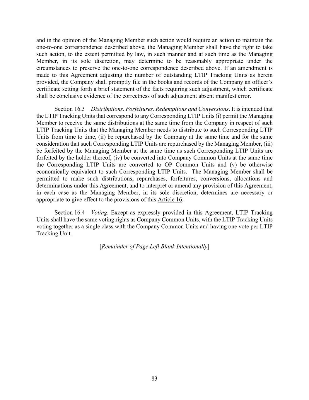 83 and in the opinion of the Managing Member such action would require an action to maintain the one-to-one correspondence described above, the Managing Member shall have the right to take such action, to the extent permitted by law, in such manner and at such time as the Managing Member, in its sole discretion, may determine to be reasonably appropriate under the circumstances to preserve the one-to-one correspondence described above. If an amendment is made to this Agreement adjusting the number of outstanding LTIP Tracking Units as herein provided, the Company shall promptly file in the books and records of the Company an officer’s certificate setting forth a brief statement of the facts requiring such adjustment, which certificate shall be conclusive evidence of the correctness of such adjustment absent manifest error. Section 16.3 Distributions, Forfeitures, Redemptions and Conversions. It is intended that the LTIP Tracking Units that correspond to any Corresponding LTIP Units (i) permit the Managing Member to receive the same distributions at the same time from the Company in respect of such LTIP Tracking Units that the Managing Member needs to distribute to such Corresponding LTIP Units from time to time, (ii) be repurchased by the Company at the same time and for the same consideration that such Corresponding LTIP Units are repurchased by the Managing Member, (iii) be forfeited by the Managing Member at the same time as such Corresponding LTIP Units are forfeited by the holder thereof, (iv) be converted into Company Common Units at the same time the Corresponding LTIP Units are converted to OP Common Units and (v) be otherwise economically equivalent to such Corresponding LTIP Units. The Managing Member shall be permitted to make such distributions, repurchases, forfeitures, conversions, allocations and determinations under this Agreement, and to interpret or amend any provision of this Agreement, in each case as the Managing Member, in its sole discretion, determines are necessary or appropriate to give effect to the provisions of this Article 16. Section 16.4 Voting. Except as expressly provided in this Agreement, LTIP Tracking Units shall have the same voting rights as Company Common Units, with the LTIP Tracking Units voting together as a single class with the Company Common Units and having one vote per LTIP Tracking Unit. [Remainder of Page Left Blank Intentionally]