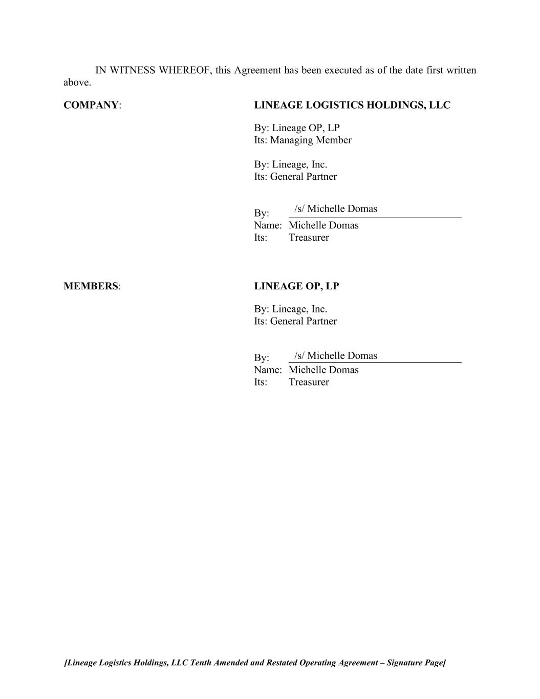 [Lineage Logistics Holdings, LLC Tenth Amended and Restated Operating Agreement – Signature Page] /s/ Michelle Domas /s/ Michelle Domas IN WITNESS WHEREOF, this Agreement has been executed as of the date first written above. COMPANY: LINEAGE LOGISTICS HOLDINGS, LLC By: Lineage OP, LP Its: Managing Member By: Lineage, Inc. Its: General Partner By: Name: Michelle Domas Its: Treasurer MEMBERS: LINEAGE OP, LP By: Lineage, Inc. Its: General Partner By: Name: Michelle Domas Its: Treasurer