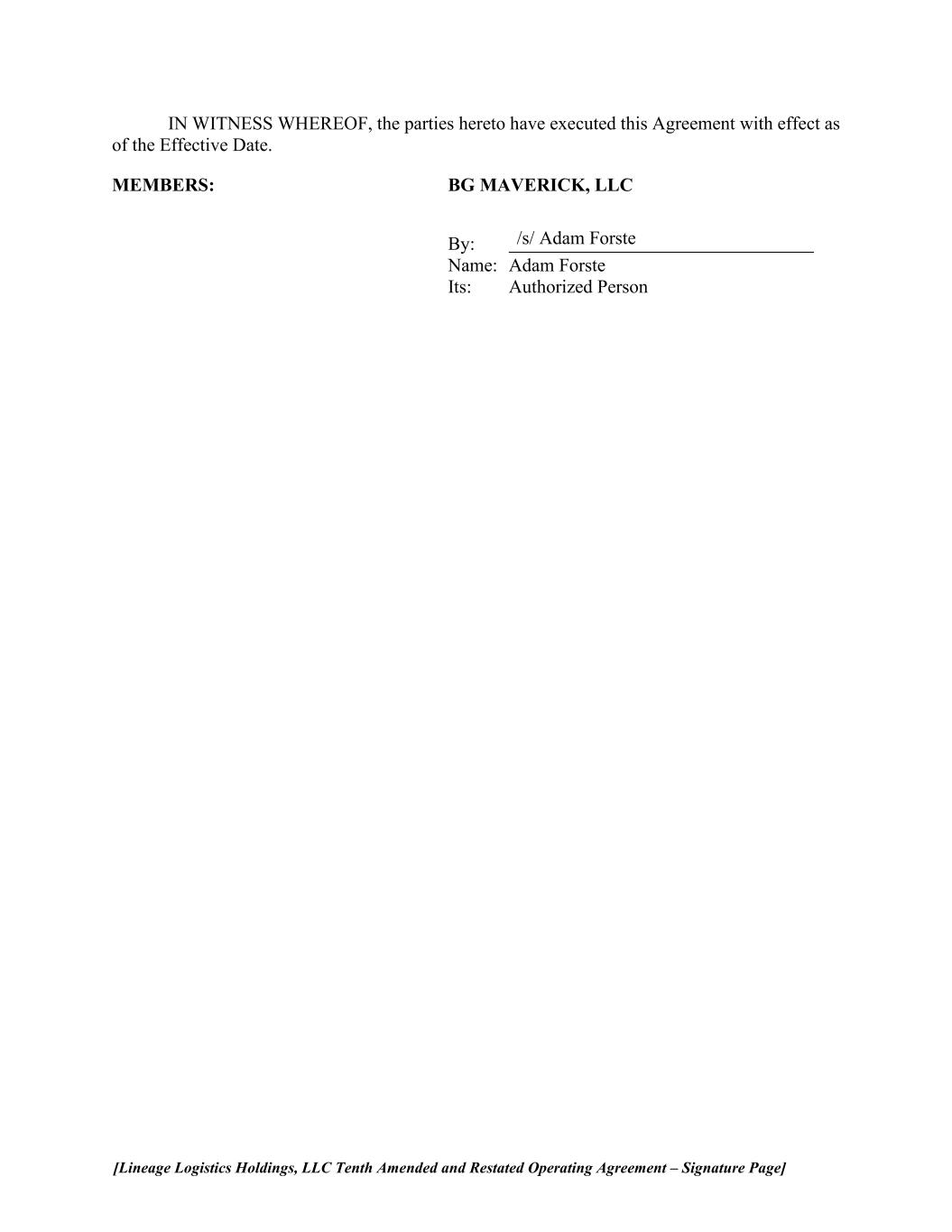 [Lineage Logistics Holdings, LLC Tenth Amended and Restated Operating Agreement – Signature Page] /s/ Adam Forste IN WITNESS WHEREOF, the parties hereto have executed this Agreement with effect as of the Effective Date. MEMBERS: BG MAVERICK, LLC By: Name: Adam Forste Its: Authorized Person