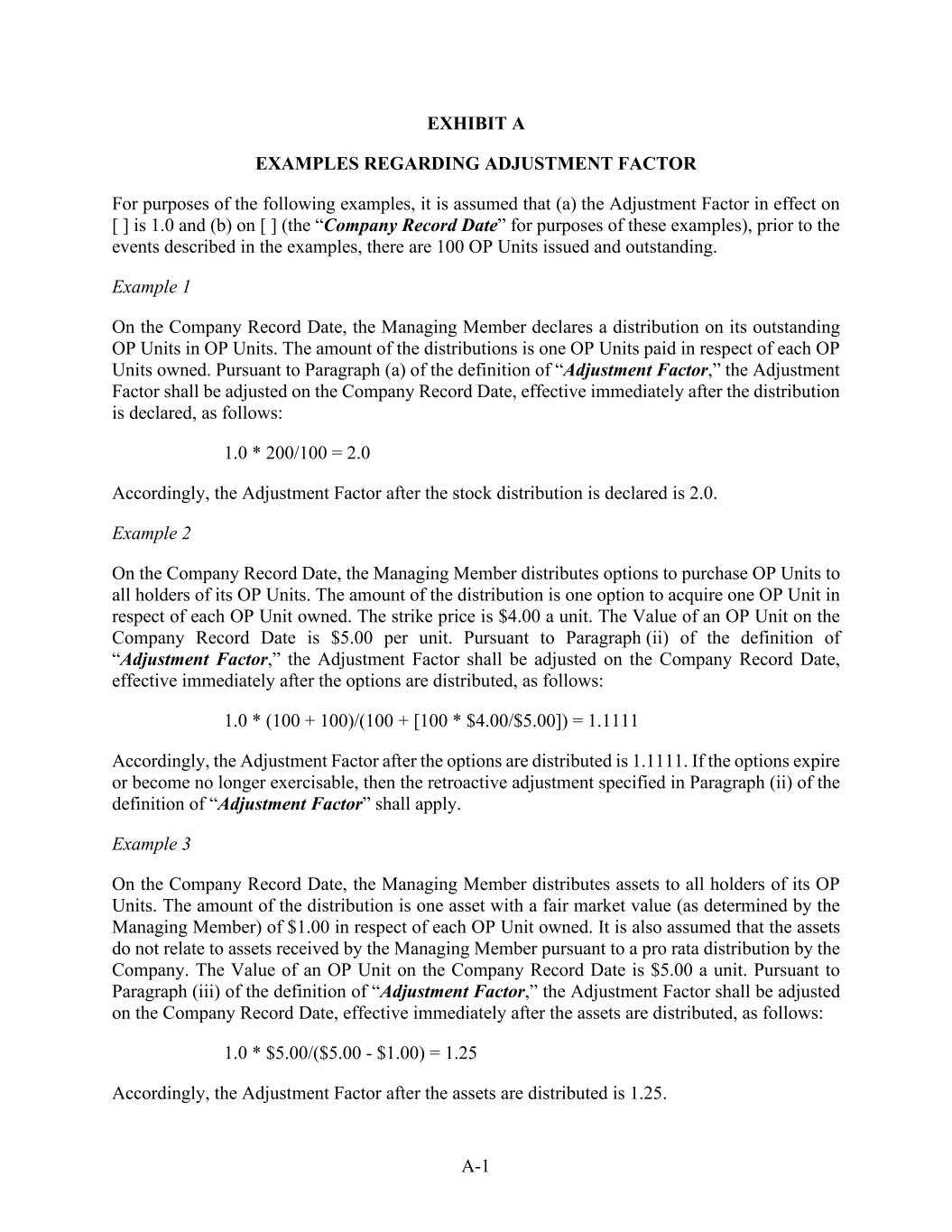 A-1 EXHIBIT A EXAMPLES REGARDING ADJUSTMENT FACTOR For purposes of the following examples, it is assumed that (a) the Adjustment Factor in effect on [ ] is 1.0 and (b) on [ ] (the “Company Record Date” for purposes of these examples), prior to the events described in the examples, there are 100 OP Units issued and outstanding. Example 1 On the Company Record Date, the Managing Member declares a distribution on its outstanding OP Units in OP Units. The amount of the distributions is one OP Units paid in respect of each OP Units owned. Pursuant to Paragraph (a) of the definition of “Adjustment Factor,” the Adjustment Factor shall be adjusted on the Company Record Date, effective immediately after the distribution is declared, as follows: 1.0 * 200/100 = 2.0 Accordingly, the Adjustment Factor after the stock distribution is declared is 2.0. Example 2 On the Company Record Date, the Managing Member distributes options to purchase OP Units to all holders of its OP Units. The amount of the distribution is one option to acquire one OP Unit in respect of each OP Unit owned. The strike price is $4.00 a unit. The Value of an OP Unit on the Company Record Date is $5.00 per unit. Pursuant to Paragraph (ii) of the definition of “Adjustment Factor,” the Adjustment Factor shall be adjusted on the Company Record Date, effective immediately after the options are distributed, as follows: 1.0 * (100 + 100)/(100 + [100 * $4.00/$5.00]) = 1.1111 Accordingly, the Adjustment Factor after the options are distributed is 1.1111. If the options expire or become no longer exercisable, then the retroactive adjustment specified in Paragraph (ii) of the definition of “Adjustment Factor” shall apply. Example 3 On the Company Record Date, the Managing Member distributes assets to all holders of its OP Units. The amount of the distribution is one asset with a fair market value (as determined by the Managing Member) of $1.00 in respect of each OP Unit owned. It is also assumed that the assets do not relate to assets received by the Managing Member pursuant to a pro rata distribution by the Company. The Value of an OP Unit on the Company Record Date is $5.00 a unit. Pursuant to Paragraph (iii) of the definition of “Adjustment Factor,” the Adjustment Factor shall be adjusted on the Company Record Date, effective immediately after the assets are distributed, as follows: 1.0 * $5.00/($5.00 - $1.00) = 1.25 Accordingly, the Adjustment Factor after the assets are distributed is 1.25.