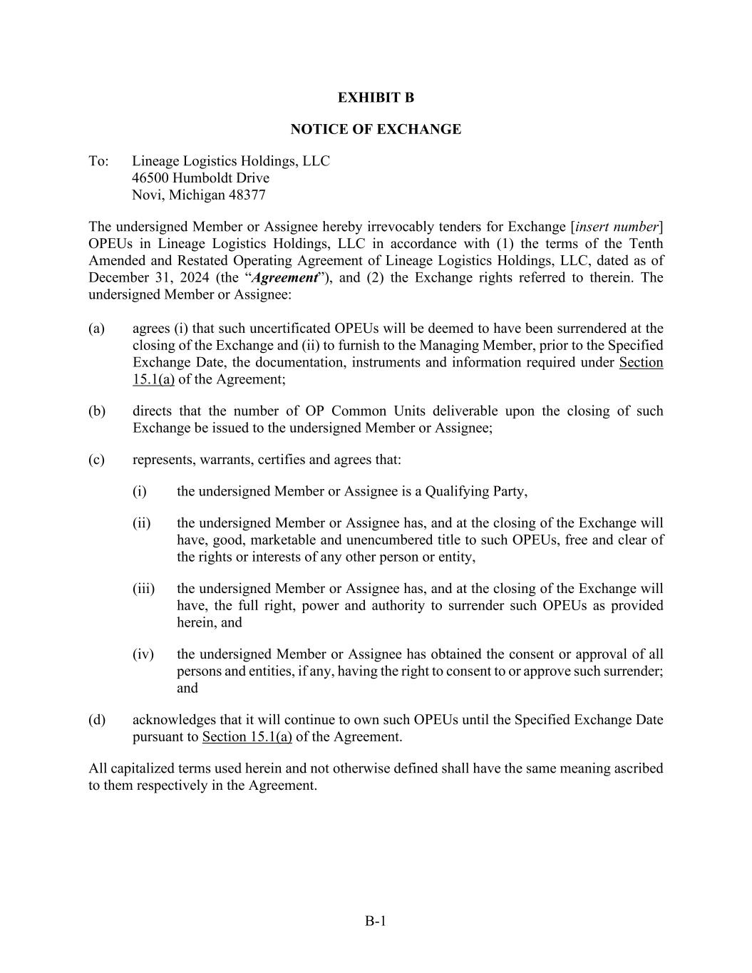 B-1 EXHIBIT B NOTICE OF EXCHANGE To: Lineage Logistics Holdings, LLC 46500 Humboldt Drive Novi, Michigan 48377 The undersigned Member or Assignee hereby irrevocably tenders for Exchange [insert number] OPEUs in Lineage Logistics Holdings, LLC in accordance with (1) the terms of the Tenth Amended and Restated Operating Agreement of Lineage Logistics Holdings, LLC, dated as of December 31, 2024 (the “Agreement”), and (2) the Exchange rights referred to therein. The undersigned Member or Assignee: (a) agrees (i) that such uncertificated OPEUs will be deemed to have been surrendered at the closing of the Exchange and (ii) to furnish to the Managing Member, prior to the Specified Exchange Date, the documentation, instruments and information required under Section 15.1(a) of the Agreement; (b) directs that the number of OP Common Units deliverable upon the closing of such Exchange be issued to the undersigned Member or Assignee; (c) represents, warrants, certifies and agrees that: (i) the undersigned Member or Assignee is a Qualifying Party, (ii) the undersigned Member or Assignee has, and at the closing of the Exchange will have, good, marketable and unencumbered title to such OPEUs, free and clear of the rights or interests of any other person or entity, (iii) the undersigned Member or Assignee has, and at the closing of the Exchange will have, the full right, power and authority to surrender such OPEUs as provided herein, and (iv) the undersigned Member or Assignee has obtained the consent or approval of all persons and entities, if any, having the right to consent to or approve such surrender; and (d) acknowledges that it will continue to own such OPEUs until the Specified Exchange Date pursuant to Section 15.1(a) of the Agreement. All capitalized terms used herein and not otherwise defined shall have the same meaning ascribed to them respectively in the Agreement.