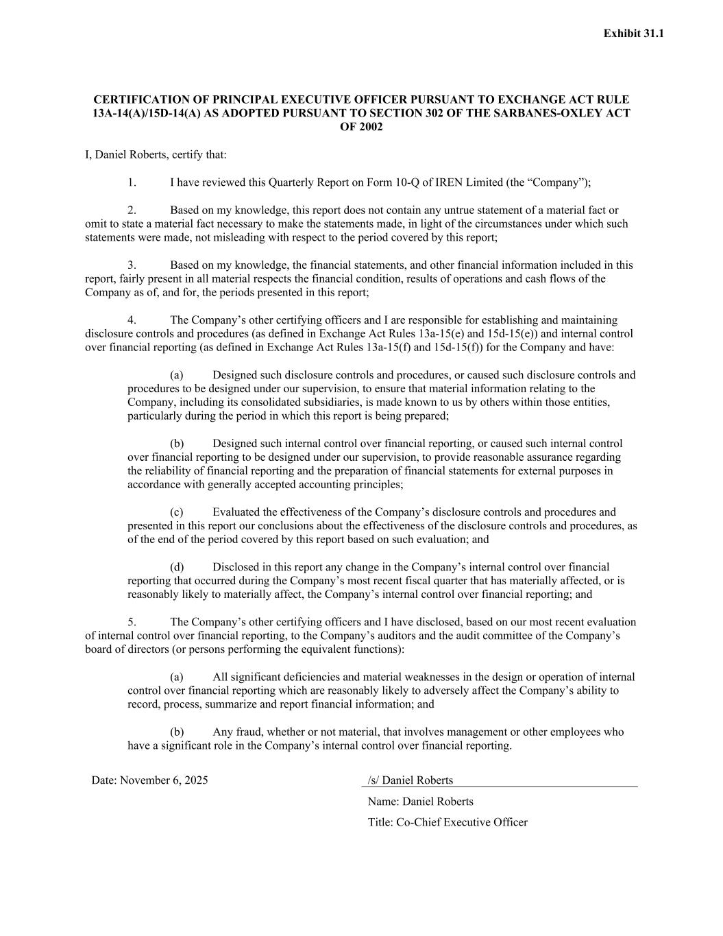 CERTIFICATION OF PRINCIPAL EXECUTIVE OFFICER PURSUANT TO EXCHANGE ACT RULE 13A-14(A)/15D-14(A) AS ADOPTED PURSUANT TO SECTION 302 OF THE SARBANES-OXLEY ACT OF 2002 I, Daniel Roberts, certify that: 1. I have reviewed this Quarterly Report on Form 10-Q of IREN Limited (the “Company”); 2. Based on my knowledge, this report does not contain any untrue statement of a material fact or omit to state a material fact necessary to make the statements made, in light of the circumstances under which such statements were made, not misleading with respect to the period covered by this report; 3. Based on my knowledge, the financial statements, and other financial information included in this report, fairly present in all material respects the financial condition, results of operations and cash flows of the Company as of, and for, the periods presented in this report; 4. The Company’s other certifying officers and I are responsible for establishing and maintaining disclosure controls and procedures (as defined in Exchange Act Rules 13a-15(e) and 15d-15(e)) and internal control over financial reporting (as defined in Exchange Act Rules 13a-15(f) and 15d-15(f)) for the Company and have: (a) Designed such disclosure controls and procedures, or caused such disclosure controls and procedures to be designed under our supervision, to ensure that material information relating to the Company, including its consolidated subsidiaries, is made known to us by others within those entities, particularly during the period in which this report is being prepared; (b) Designed such internal control over financial reporting, or caused such internal control over financial reporting to be designed under our supervision, to provide reasonable assurance regarding the reliability of financial reporting and the preparation of financial statements for external purposes in accordance with generally accepted accounting principles; (c) Evaluated the effectiveness of the Company’s disclosure controls and procedures and presented in this report our conclusions about the effectiveness of the disclosure controls and procedures, as of the end of the period covered by this report based on such evaluation; and (d) Disclosed in this report any change in the Company’s internal control over financial reporting that occurred during the Company’s most recent fiscal quarter that has materially affected, or is reasonably likely to materially affect, the Company’s internal control over financial reporting; and 5. The Company’s other certifying officers and I have disclosed, based on our most recent evaluation of internal control over financial reporting, to the Company’s auditors and the audit committee of the Company’s board of directors (or persons performing the equivalent functions): (a) All significant deficiencies and material weaknesses in the design or operation of internal control over financial reporting which are reasonably likely to adversely affect the Company’s ability to record, process, summarize and report financial information; and (b) Any fraud, whether or not material, that involves management or other employees who have a significant role in the Company’s internal control over financial reporting. Date: November 6, 2025 /s/ Daniel Roberts Name: Daniel Roberts Title: Co-Chief Executive Officer Exhibit 31.1