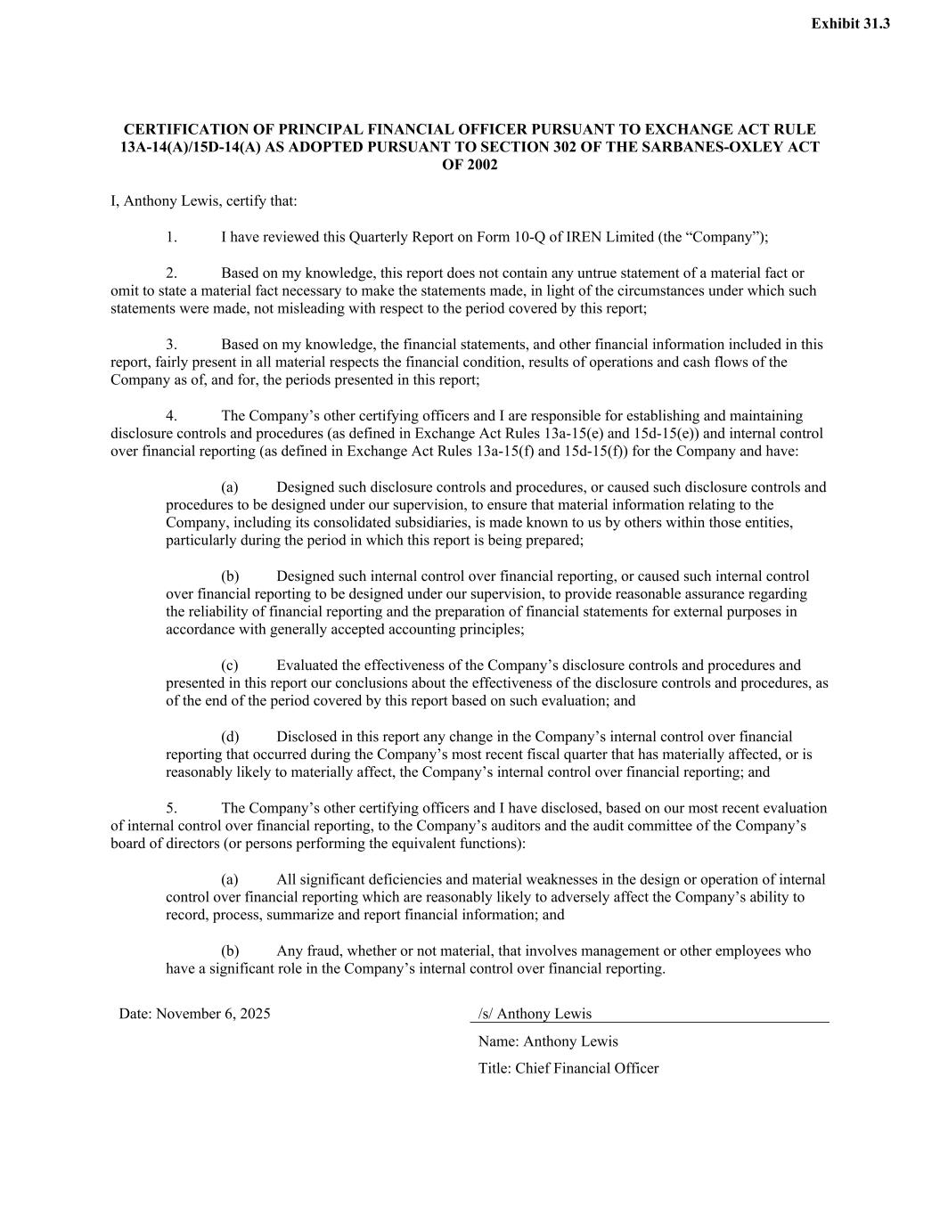 CERTIFICATION OF PRINCIPAL FINANCIAL OFFICER PURSUANT TO EXCHANGE ACT RULE 13A-14(A)/15D-14(A) AS ADOPTED PURSUANT TO SECTION 302 OF THE SARBANES-OXLEY ACT OF 2002 I, Anthony Lewis, certify that: 1. I have reviewed this Quarterly Report on Form 10-Q of IREN Limited (the “Company”); 2. Based on my knowledge, this report does not contain any untrue statement of a material fact or omit to state a material fact necessary to make the statements made, in light of the circumstances under which such statements were made, not misleading with respect to the period covered by this report; 3. Based on my knowledge, the financial statements, and other financial information included in this report, fairly present in all material respects the financial condition, results of operations and cash flows of the Company as of, and for, the periods presented in this report; 4. The Company’s other certifying officers and I are responsible for establishing and maintaining disclosure controls and procedures (as defined in Exchange Act Rules 13a-15(e) and 15d-15(e)) and internal control over financial reporting (as defined in Exchange Act Rules 13a-15(f) and 15d-15(f)) for the Company and have: (a) Designed such disclosure controls and procedures, or caused such disclosure controls and procedures to be designed under our supervision, to ensure that material information relating to the Company, including its consolidated subsidiaries, is made known to us by others within those entities, particularly during the period in which this report is being prepared; (b) Designed such internal control over financial reporting, or caused such internal control over financial reporting to be designed under our supervision, to provide reasonable assurance regarding the reliability of financial reporting and the preparation of financial statements for external purposes in accordance with generally accepted accounting principles; (c) Evaluated the effectiveness of the Company’s disclosure controls and procedures and presented in this report our conclusions about the effectiveness of the disclosure controls and procedures, as of the end of the period covered by this report based on such evaluation; and (d) Disclosed in this report any change in the Company’s internal control over financial reporting that occurred during the Company’s most recent fiscal quarter that has materially affected, or is reasonably likely to materially affect, the Company’s internal control over financial reporting; and 5. The Company’s other certifying officers and I have disclosed, based on our most recent evaluation of internal control over financial reporting, to the Company’s auditors and the audit committee of the Company’s board of directors (or persons performing the equivalent functions): (a) All significant deficiencies and material weaknesses in the design or operation of internal control over financial reporting which are reasonably likely to adversely affect the Company’s ability to record, process, summarize and report financial information; and (b) Any fraud, whether or not material, that involves management or other employees who have a significant role in the Company’s internal control over financial reporting. Date: November 6, 2025 /s/ Anthony Lewis Name: Anthony Lewis Title: Chief Financial Officer Exhibit 31.3