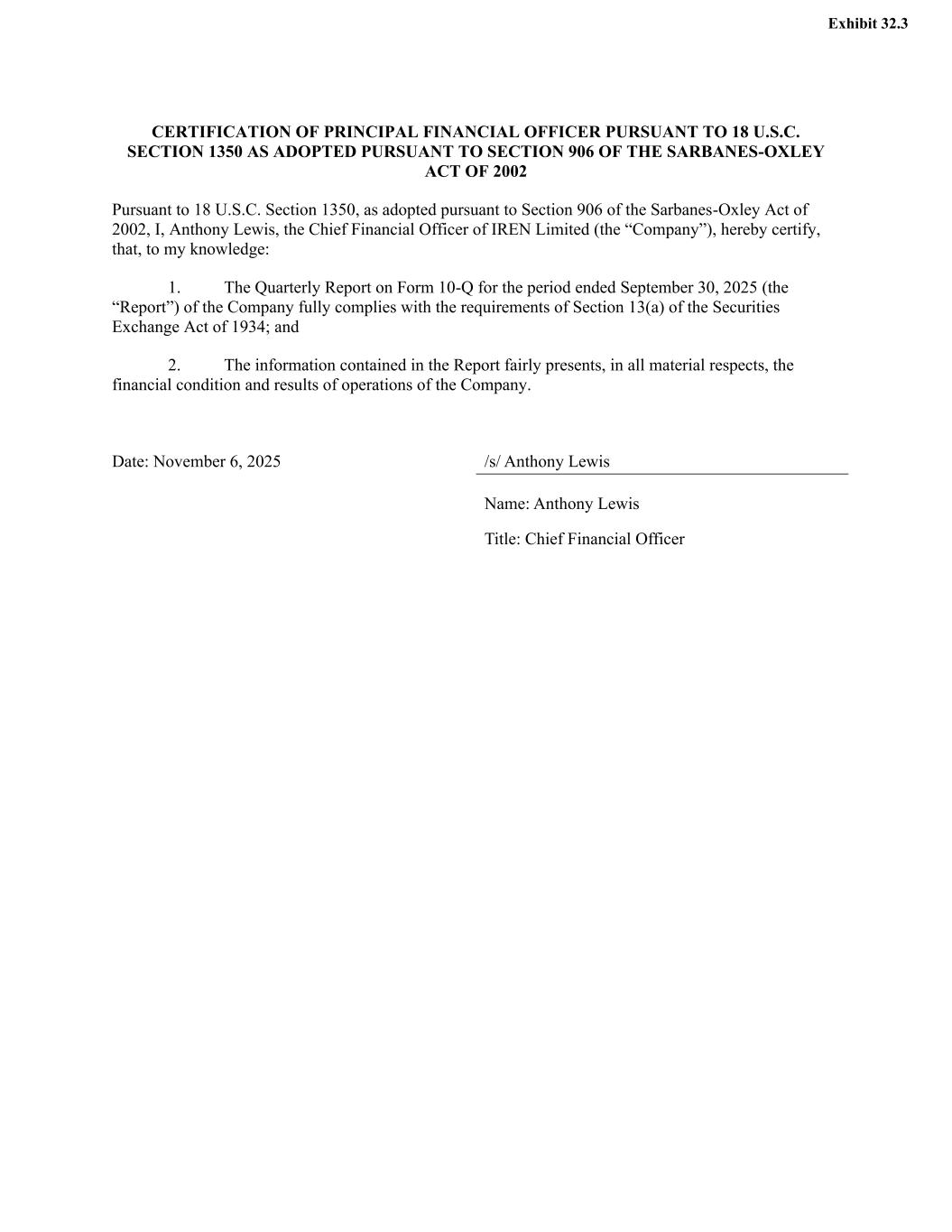 Exhibit 32.3 CERTIFICATION OF PRINCIPAL FINANCIAL OFFICER PURSUANT TO 18 U.S.C. SECTION 1350 AS ADOPTED PURSUANT TO SECTION 906 OF THE SARBANES-OXLEY ACT OF 2002 Pursuant to 18 U.S.C. Section 1350, as adopted pursuant to Section 906 of the Sarbanes-Oxley Act of 2002, I, Anthony Lewis, the Chief Financial Officer of IREN Limited (the “Company”), hereby certify, that, to my knowledge: 1. The Quarterly Report on Form 10-Q for the period ended September 30, 2025 (the “Report”) of the Company fully complies with the requirements of Section 13(a) of the Securities Exchange Act of 1934; and 2. The information contained in the Report fairly presents, in all material respects, the financial condition and results of operations of the Company. Date: November 6, 2025 /s/ Anthony Lewis Name: Anthony Lewis Title: Chief Financial Officer