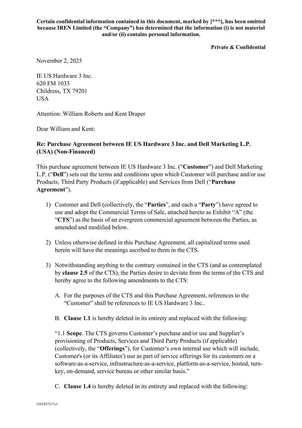 Certain confidential information contained in this document, marked by [***], has been omitted because IREN Limited (the “Company”) has determined that the information (i) is not material and/or (ii) contains personal information. Private & Confidential #101837317v3 November 2, 2025 IE US Hardware 3 Inc. 620 FM 1033 Childress, TX 79201 USA Attention: William Roberts and Kent Draper Dear William and Kent: Re: Purchase Agreement between IE US Hardware 3 Inc. and Dell Marketing L.P. (USA) (Non-Financed) This purchase agreement between IE US Hardware 3 Inc. (“Customer”) and Dell Marketing L.P. (“Dell”) sets out the terms and conditions upon which Customer will purchase and/or use Products, Third Party Products (if applicable) and Services from Dell (“Purchase Agreement”). 1) Customer and Dell (collectively, the “Parties”, and each a “Party”) have agreed to use and adopt the Commercial Terms of Sale, attached hereto as Exhibit “A” (the “CTS”) as the basis of an evergreen commercial agreement between the Parties, as amended and modified below. 2) Unless otherwise defined in this Purchase Agreement, all capitalized terms used herein will have the meanings ascribed to them in the CTS. 3) Notwithstanding anything to the contrary contained in the CTS (and as contemplated by clause 2.5 of the CTS), the Parties desire to deviate from the terms of the CTS and hereby agree to the following amendments to the CTS: A. For the purposes of the CTS and this Purchase Agreement, references to the “Customer” shall be references to IE US Hardware 3 Inc.. B. Clause 1.1 is hereby deleted in its entirety and replaced with the following: “1.1 Scope. The CTS governs Customer’s purchase and/or use and Supplier’s provisioning of Products, Services and Third Party Products (if applicable) (collectively, the “Offerings”), for Customer’s own internal use which will include, Customer's (or its Affiliates') use as part of service offerings for its customers on a software-as-a-service, infrastructure-as-a-service, platform-as-a-service, hosted, turn- key, on-demand, service bureau or other similar basis.” C. Clause 1.4 is hereby deleted in its entirety and replaced with the following:
