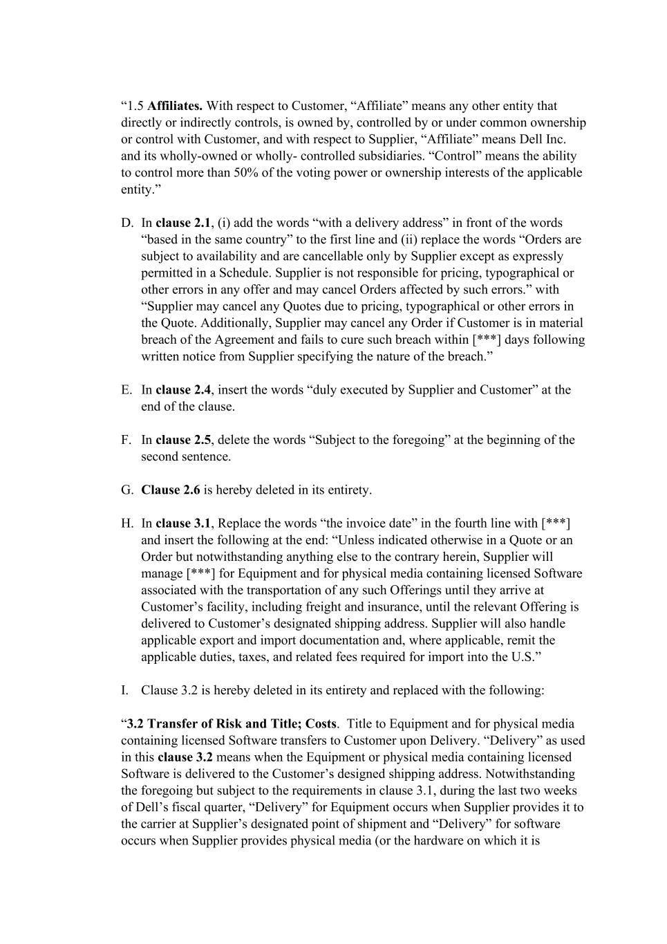 “1.5 Affiliates. With respect to Customer, “Affiliate” means any other entity that directly or indirectly controls, is owned by, controlled by or under common ownership or control with Customer, and with respect to Supplier, “Affiliate” means Dell Inc. and its wholly-owned or wholly- controlled subsidiaries. “Control” means the ability to control more than 50% of the voting power or ownership interests of the applicable entity.” D. In clause 2.1, (i) add the words “with a delivery address” in front of the words “based in the same country” to the first line and (ii) replace the words “Orders are subject to availability and are cancellable only by Supplier except as expressly permitted in a Schedule. Supplier is not responsible for pricing, typographical or other errors in any offer and may cancel Orders affected by such errors.” with “Supplier may cancel any Quotes due to pricing, typographical or other errors in the Quote. Additionally, Supplier may cancel any Order if Customer is in material breach of the Agreement and fails to cure such breach within [***] days following written notice from Supplier specifying the nature of the breach.” E. In clause 2.4, insert the words “duly executed by Supplier and Customer” at the end of the clause. F. In clause 2.5, delete the words “Subject to the foregoing” at the beginning of the second sentence. G. Clause 2.6 is hereby deleted in its entirety. H. In clause 3.1, Replace the words “the invoice date” in the fourth line with [***] and insert the following at the end: “Unless indicated otherwise in a Quote or an Order but notwithstanding anything else to the contrary herein, Supplier will manage [***] for Equipment and for physical media containing licensed Software associated with the transportation of any such Offerings until they arrive at Customer’s facility, including freight and insurance, until the relevant Offering is delivered to Customer’s designated shipping address. Supplier will also handle applicable export and import documentation and, where applicable, remit the applicable duties, taxes, and related fees required for import into the U.S.” I. Clause 3.2 is hereby deleted in its entirety and replaced with the following: “3.2 Transfer of Risk and Title; Costs. Title to Equipment and for physical media containing licensed Software transfers to Customer upon Delivery. “Delivery” as used in this clause 3.2 means when the Equipment or physical media containing licensed Software is delivered to the Customer’s designed shipping address. Notwithstanding the foregoing but subject to the requirements in clause 3.1, during the last two weeks of Dell’s fiscal quarter, “Delivery” for Equipment occurs when Supplier provides it to the carrier at Supplier’s designated point of shipment and “Delivery” for software occurs when Supplier provides physical media (or the hardware on which it is