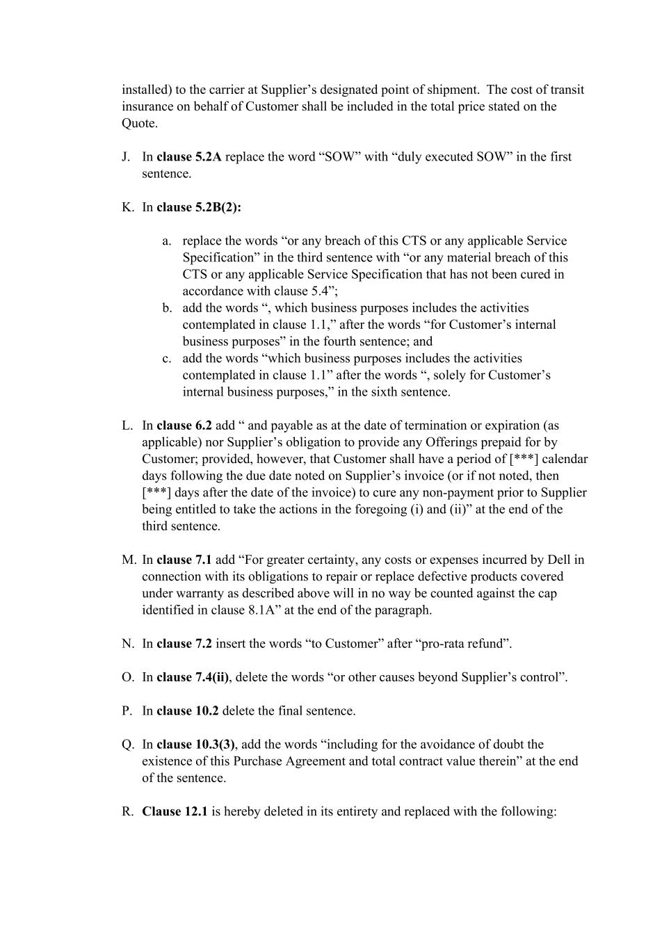 installed) to the carrier at Supplier’s designated point of shipment. The cost of transit insurance on behalf of Customer shall be included in the total price stated on the Quote. J. In clause 5.2A replace the word “SOW” with “duly executed SOW” in the first sentence. K. In clause 5.2B(2): a. replace the words “or any breach of this CTS or any applicable Service Specification” in the third sentence with “or any material breach of this CTS or any applicable Service Specification that has not been cured in accordance with clause 5.4”; b. add the words “, which business purposes includes the activities contemplated in clause 1.1,” after the words “for Customer’s internal business purposes” in the fourth sentence; and c. add the words “which business purposes includes the activities contemplated in clause 1.1” after the words “, solely for Customer’s internal business purposes,” in the sixth sentence. L. In clause 6.2 add “ and payable as at the date of termination or expiration (as applicable) nor Supplier’s obligation to provide any Offerings prepaid for by Customer; provided, however, that Customer shall have a period of [***] calendar days following the due date noted on Supplier’s invoice (or if not noted, then [***] days after the date of the invoice) to cure any non-payment prior to Supplier being entitled to take the actions in the foregoing (i) and (ii)” at the end of the third sentence. M. In clause 7.1 add “For greater certainty, any costs or expenses incurred by Dell in connection with its obligations to repair or replace defective products covered under warranty as described above will in no way be counted against the cap identified in clause 8.1A” at the end of the paragraph. N. In clause 7.2 insert the words “to Customer” after “pro-rata refund”. O. In clause 7.4(ii), delete the words “or other causes beyond Supplier’s control”. P. In clause 10.2 delete the final sentence. Q. In clause 10.3(3), add the words “including for the avoidance of doubt the existence of this Purchase Agreement and total contract value therein” at the end of the sentence. R. Clause 12.1 is hereby deleted in its entirety and replaced with the following: