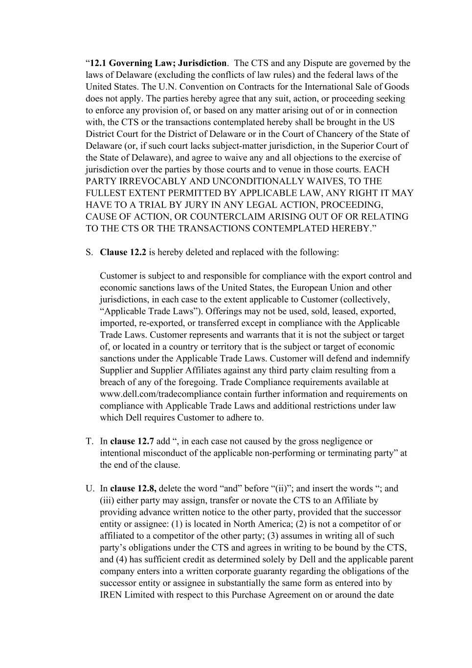 “12.1 Governing Law; Jurisdiction. The CTS and any Dispute are governed by the laws of Delaware (excluding the conflicts of law rules) and the federal laws of the United States. The U.N. Convention on Contracts for the International Sale of Goods does not apply. The parties hereby agree that any suit, action, or proceeding seeking to enforce any provision of, or based on any matter arising out of or in connection with, the CTS or the transactions contemplated hereby shall be brought in the US District Court for the District of Delaware or in the Court of Chancery of the State of Delaware (or, if such court lacks subject-matter jurisdiction, in the Superior Court of the State of Delaware), and agree to waive any and all objections to the exercise of jurisdiction over the parties by those courts and to venue in those courts. EACH PARTY IRREVOCABLY AND UNCONDITIONALLY WAIVES, TO THE FULLEST EXTENT PERMITTED BY APPLICABLE LAW, ANY RIGHT IT MAY HAVE TO A TRIAL BY JURY IN ANY LEGAL ACTION, PROCEEDING, CAUSE OF ACTION, OR COUNTERCLAIM ARISING OUT OF OR RELATING TO THE CTS OR THE TRANSACTIONS CONTEMPLATED HEREBY.” S. Clause 12.2 is hereby deleted and replaced with the following: Customer is subject to and responsible for compliance with the export control and economic sanctions laws of the United States, the European Union and other jurisdictions, in each case to the extent applicable to Customer (collectively, “Applicable Trade Laws”). Offerings may not be used, sold, leased, exported, imported, re-exported, or transferred except in compliance with the Applicable Trade Laws. Customer represents and warrants that it is not the subject or target of, or located in a country or territory that is the subject or target of economic sanctions under the Applicable Trade Laws. Customer will defend and indemnify Supplier and Supplier Affiliates against any third party claim resulting from a breach of any of the foregoing. Trade Compliance requirements available at www.dell.com/tradecompliance contain further information and requirements on compliance with Applicable Trade Laws and additional restrictions under law which Dell requires Customer to adhere to. T. In clause 12.7 add “, in each case not caused by the gross negligence or intentional misconduct of the applicable non-performing or terminating party” at the end of the clause. U. In clause 12.8, delete the word “and” before “(ii)”; and insert the words “; and (iii) either party may assign, transfer or novate the CTS to an Affiliate by providing advance written notice to the other party, provided that the successor entity or assignee: (1) is located in North America; (2) is not a competitor of or affiliated to a competitor of the other party; (3) assumes in writing all of such party’s obligations under the CTS and agrees in writing to be bound by the CTS, and (4) has sufficient credit as determined solely by Dell and the applicable parent company enters into a written corporate guaranty regarding the obligations of the successor entity or assignee in substantially the same form as entered into by IREN Limited with respect to this Purchase Agreement on or around the date