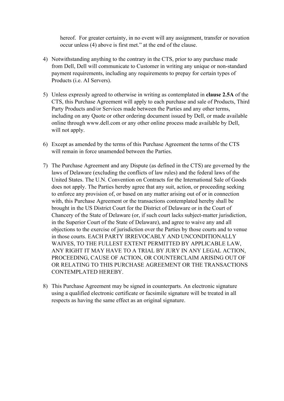 hereof. For greater certainty, in no event will any assignment, transfer or novation occur unless (4) above is first met.” at the end of the clause. 4) Notwithstanding anything to the contrary in the CTS, prior to any purchase made from Dell, Dell will communicate to Customer in writing any unique or non-standard payment requirements, including any requirements to prepay for certain types of Products (i.e. AI Servers). 5) Unless expressly agreed to otherwise in writing as contemplated in clause 2.5A of the CTS, this Purchase Agreement will apply to each purchase and sale of Products, Third Party Products and/or Services made between the Parties and any other terms, including on any Quote or other ordering document issued by Dell, or made available online through www.dell.com or any other online process made available by Dell, will not apply. 6) Except as amended by the terms of this Purchase Agreement the terms of the CTS will remain in force unamended between the Parties. 7) The Purchase Agreement and any Dispute (as defined in the CTS) are governed by the laws of Delaware (excluding the conflicts of law rules) and the federal laws of the United States. The U.N. Convention on Contracts for the International Sale of Goods does not apply. The Parties hereby agree that any suit, action, or proceeding seeking to enforce any provision of, or based on any matter arising out of or in connection with, this Purchase Agreement or the transactions contemplated hereby shall be brought in the US District Court for the District of Delaware or in the Court of Chancery of the State of Delaware (or, if such court lacks subject-matter jurisdiction, in the Superior Court of the State of Delaware), and agree to waive any and all objections to the exercise of jurisdiction over the Parties by those courts and to venue in those courts. EACH PARTY IRREVOCABLY AND UNCONDITIONALLY WAIVES, TO THE FULLEST EXTENT PERMITTED BY APPLICABLE LAW, ANY RIGHT IT MAY HAVE TO A TRIAL BY JURY IN ANY LEGAL ACTION, PROCEEDING, CAUSE OF ACTION, OR COUNTERCLAIM ARISING OUT OF OR RELATING TO THIS PURCHASE AGREEMENT OR THE TRANSACTIONS CONTEMPLATED HEREBY. 8) This Purchase Agreement may be signed in counterparts. An electronic signature using a qualified electronic certificate or facsimile signature will be treated in all respects as having the same effect as an original signature.