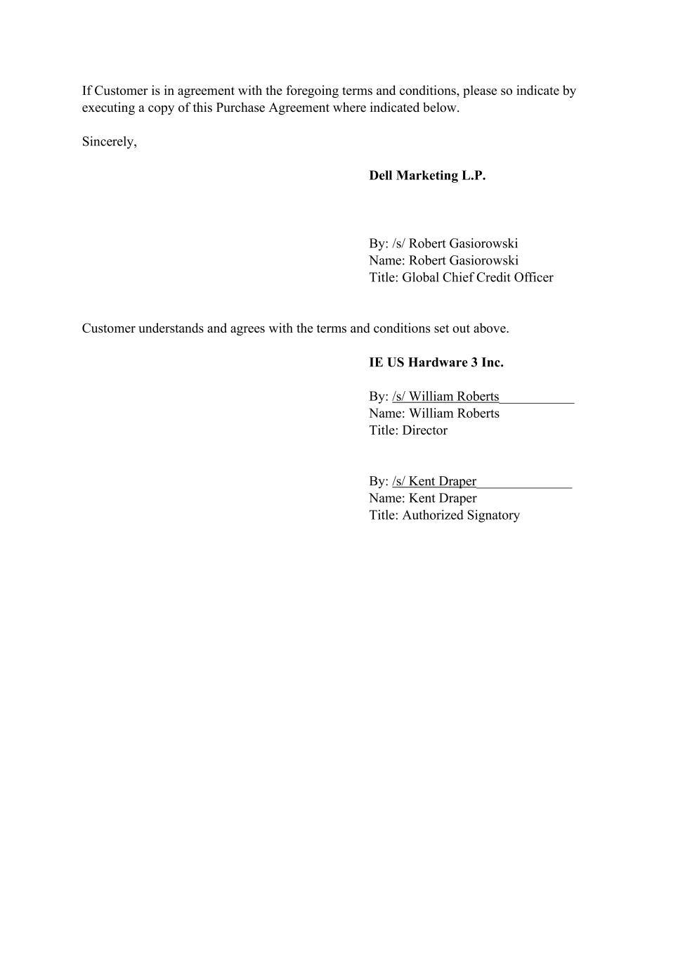 If Customer is in agreement with the foregoing terms and conditions, please so indicate by executing a copy of this Purchase Agreement where indicated below. Sincerely, Dell Marketing L.P. By: /s/ Robert Gasiorowski Name: Robert Gasiorowski Title: Global Chief Credit Officer Customer understands and agrees with the terms and conditions set out above. IE US Hardware 3 Inc. By: /s/ William Roberts___________ Name: William Roberts Title: Director By: /s/ Kent Draper______________ Name: Kent Draper Title: Authorized Signatory