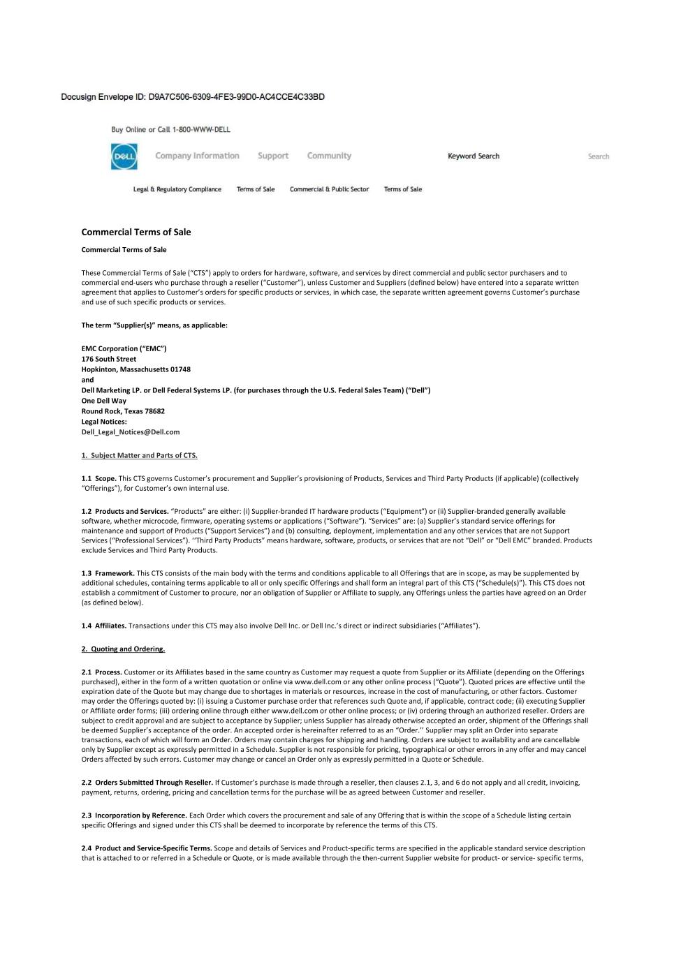 Commercial Terms of Sale Commercial Terms of Sale These Commercial Terms of Sale (“CTS”) apply to orders for hardware, software, and services by direct commercial and public sector purchasers and to commercial end-users who purchase through a reseller (“Customer”), unless Customer and Suppliers (defined below) have entered into a separate written agreement that applies to Customer’s orders for specific products or services, in which case, the separate written agreement governs Customer’s purchase and use of such specific products or services. The term “Supplier(s)” means, as applicable: EMC Corporation (“EMC”) 176 South Street Hopkinton, Massachusetts 01748 and Dell Marketing LP. or Dell Federal Systems LP. (for purchases through the U.S. Federal Sales Team) (“Dell”) One Dell Way Round Rock, Texas 78682 Legal Notices: Dell_Legal_Notices@Dell.com 1. Subject Matter and Parts of CTS. 1.1 Scope. This CTS governs Customer’s procurement and Supplier’s provisioning of Products, Services and Third Party Products (if applicable) (collectively “Offerings”), for Customer’s own internal use. 1.2 Products and Services. “Products” are either: (i) Supplier-branded IT hardware products (“Equipment”) or (ii) Supplier-branded generally available software, whether microcode, firmware, operating systems or applications (“Software”). “Services” are: (a) Supplier’s standard service offerings for maintenance and support of Products (“Support Services”) and (b) consulting, deployment, implementation and any other services that are not Support Services (“Professional Services”). ‘‘Third Party Products” means hardware, software, products, or services that are not “Dell” or “Dell EMC” branded. Products exclude Services and Third Party Products. 1.3 Framework. This CTS consists of the main body with the terms and conditions applicable to all Offerings that are in scope, as may be supplemented by additional schedules, containing terms applicable to all or only specific Offerings and shall form an integral part of this CTS (“Schedule(s)”). This CTS does not establish a commitment of Customer to procure, nor an obligation of Supplier or Affiliate to supply, any Offerings unless the parties have agreed on an Order (as defined below). 1.4 Affiliates. Transactions under this CTS may also involve Dell Inc. or Dell Inc.’s direct or indirect subsidiaries (“Affiliates”). 2. Quoting and Ordering. 2.1 Process. Customer or its Affiliates based in the same country as Customer may request a quote from Supplier or its Affiliate (depending on the Offerings purchased), either in the form of a written quotation or online via www.dell.com or any other online process (“Quote”). Quoted prices are effective until the expiration date of the Quote but may change due to shortages in materials or resources, increase in the cost of manufacturing, or other factors. Customer may order the Offerings quoted by: (i) issuing a Customer purchase order that references such Quote and, if applicable, contract code; (ii) executing Supplier or Affiliate order forms; (iii) ordering online through either www.dell.com or other online process; or (iv) ordering through an authorized reseller. Orders are subject to credit approval and are subject to acceptance by Supplier; unless Supplier has already otherwise accepted an order, shipment of the Offerings shall be deemed Supplier’s acceptance of the order. An accepted order is hereinafter referred to as an “Order.’’ Supplier may split an Order into separate transactions, each of which will form an Order. Orders may contain charges for shipping and handling. Orders are subject to availability and are cancellable only by Supplier except as expressly permitted in a Schedule. Supplier is not responsible for pricing, typographical or other errors in any offer and may cancel Orders affected by such errors. Customer may change or cancel an Order only as expressly permitted in a Quote or Schedule. 2.2 Orders Submitted Through Reseller. If Customer’s purchase is made through a reseller, then clauses 2.1, 3, and 6 do not apply and all credit, invoicing, payment, returns, ordering, pricing and cancellation terms for the purchase will be as agreed between Customer and reseller. 2.3 Incorporation by Reference. Each Order which covers the procurement and sale of any Offering that is within the scope of a Schedule listing certain specific Offerings and signed under this CTS shall be deemed to incorporate by reference the terms of this CTS. 2.4 Product and Service-Specific Terms. Scope and details of Services and Product-specific terms are specified in the applicable standard service description that is attached to or referred in a Schedule or Quote, or is made available through the then-current Supplier website for product- or service- specific terms,