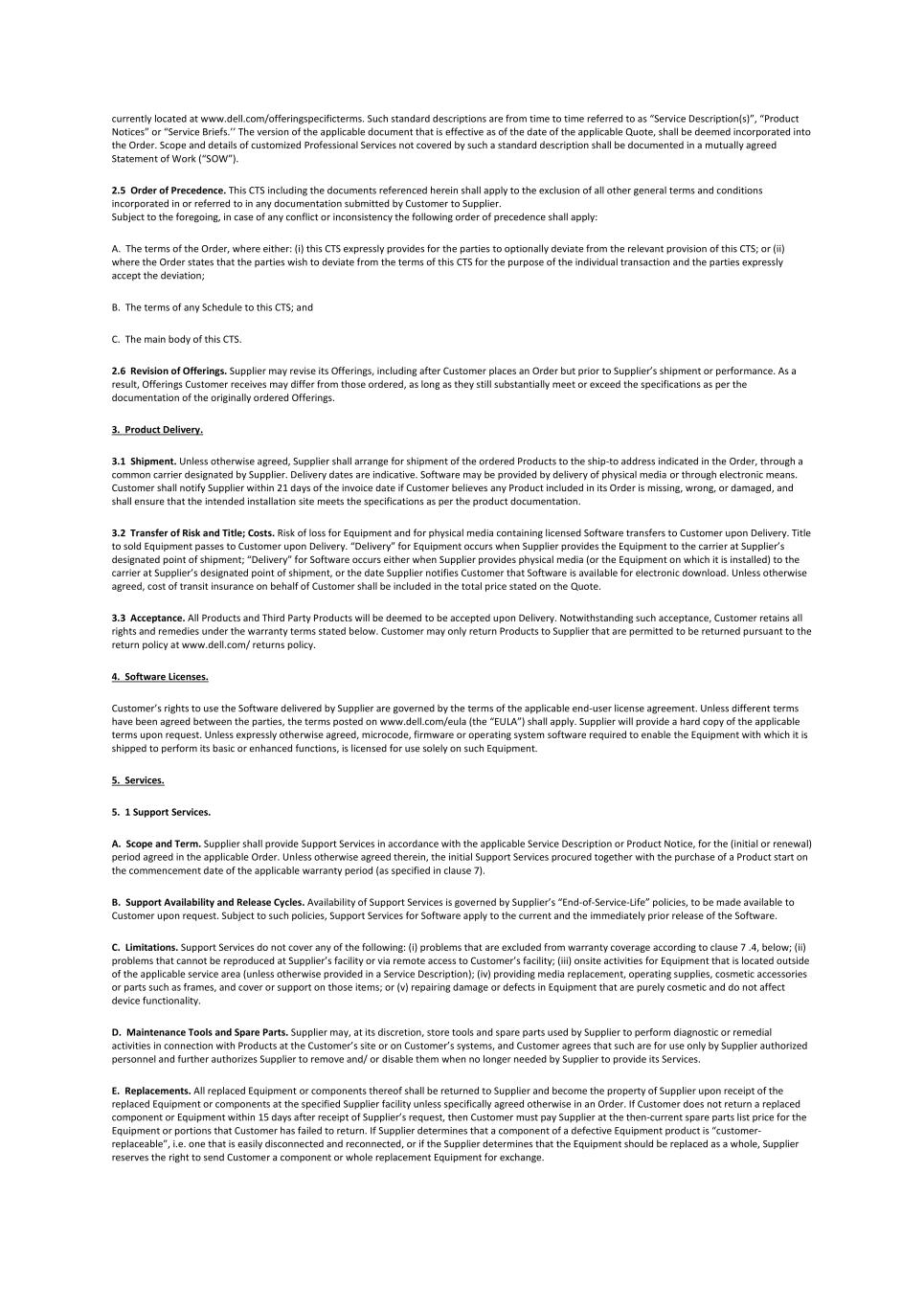 currently located at www.dell.com/offeringspecificterms. Such standard descriptions are from time to time referred to as “Service Description(s)”, “Product Notices” or “Service Briefs.’’ The version of the applicable document that is effective as of the date of the applicable Quote, shall be deemed incorporated into the Order. Scope and details of customized Professional Services not covered by such a standard description shall be documented in a mutually agreed Statement of Work (“SOW”). 2.5 Order of Precedence. This CTS including the documents referenced herein shall apply to the exclusion of all other general terms and conditions incorporated in or referred to in any documentation submitted by Customer to Supplier. Subject to the foregoing, in case of any conflict or inconsistency the following order of precedence shall apply: A. The terms of the Order, where either: (i) this CTS expressly provides for the parties to optionally deviate from the relevant provision of this CTS; or (ii) where the Order states that the parties wish to deviate from the terms of this CTS for the purpose of the individual transaction and the parties expressly accept the deviation; B. The terms of any Schedule to this CTS; and C. The main body of this CTS. 2.6 Revision of Offerings. Supplier may revise its Offerings, including after Customer places an Order but prior to Supplier’s shipment or performance. As a result, Offerings Customer receives may differ from those ordered, as long as they still substantially meet or exceed the specifications as per the documentation of the originally ordered Offerings. 3. Product Delivery. 3.1 Shipment. Unless otherwise agreed, Supplier shall arrange for shipment of the ordered Products to the ship-to address indicated in the Order, through a common carrier designated by Supplier. Delivery dates are indicative. Software may be provided by delivery of physical media or through electronic means. Customer shall notify Supplier within 21 days of the invoice date if Customer believes any Product included in its Order is missing, wrong, or damaged, and shall ensure that the intended installation site meets the specifications as per the product documentation. 3.2 Transfer of Risk and Title; Costs. Risk of loss for Equipment and for physical media containing licensed Software transfers to Customer upon Delivery. Title to sold Equipment passes to Customer upon Delivery. “Delivery” for Equipment occurs when Supplier provides the Equipment to the carrier at Supplier’s designated point of shipment; “Delivery” for Software occurs either when Supplier provides physical media (or the Equipment on which it is installed) to the carrier at Supplier’s designated point of shipment, or the date Supplier notifies Customer that Software is available for electronic download. Unless otherwise agreed, cost of transit insurance on behalf of Customer shall be included in the total price stated on the Quote. 3.3 Acceptance. All Products and Third Party Products will be deemed to be accepted upon Delivery. Notwithstanding such acceptance, Customer retains all rights and remedies under the warranty terms stated below. Customer may only return Products to Supplier that are permitted to be returned pursuant to the return policy at www.dell.com/ returns policy. 4. Software Licenses. Customer’s rights to use the Software delivered by Supplier are governed by the terms of the applicable end-user license agreement. Unless different terms have been agreed between the parties, the terms posted on www.dell.com/eula (the “EULA”) shall apply. Supplier will provide a hard copy of the applicable terms upon request. Unless expressly otherwise agreed, microcode, firmware or operating system software required to enable the Equipment with which it is shipped to perform its basic or enhanced functions, is licensed for use solely on such Equipment. 5. Services. 5. 1 Support Services. A. Scope and Term. Supplier shall provide Support Services in accordance with the applicable Service Description or Product Notice, for the (initial or renewal) period agreed in the applicable Order. Unless otherwise agreed therein, the initial Support Services procured together with the purchase of a Product start on the commencement date of the applicable warranty period (as specified in clause 7). B. Support Availability and Release Cycles. Availability of Support Services is governed by Supplier’s “End-of-Service-Life” policies, to be made available to Customer upon request. Subject to such policies, Support Services for Software apply to the current and the immediately prior release of the Software. C. Limitations. Support Services do not cover any of the following: (i) problems that are excluded from warranty coverage according to clause 7 .4, below; (ii) problems that cannot be reproduced at Supplier’s facility or via remote access to Customer’s facility; (iii) onsite activities for Equipment that is located outside of the applicable service area (unless otherwise provided in a Service Description); (iv) providing media replacement, operating supplies, cosmetic accessories or parts such as frames, and cover or support on those items; or (v) repairing damage or defects in Equipment that are purely cosmetic and do not affect device functionality. D. Maintenance Tools and Spare Parts. Supplier may, at its discretion, store tools and spare parts used by Supplier to perform diagnostic or remedial activities in connection with Products at the Customer’s site or on Customer’s systems, and Customer agrees that such are for use only by Supplier authorized personnel and further authorizes Supplier to remove and/ or disable them when no longer needed by Supplier to provide its Services. E. Replacements. All replaced Equipment or components thereof shall be returned to Supplier and become the property of Supplier upon receipt of the replaced Equipment or components at the specified Supplier facil