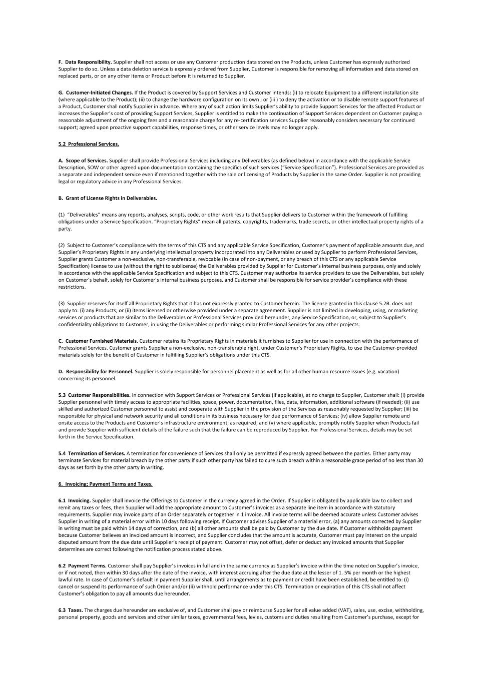 F. Data Responsibility. Supplier shall not access or use any Customer production data stored on the Products, unless Customer has expressly authorized Supplier to do so. Unless a data deletion service is expressly ordered from Supplier, Customer is responsible for removing all information and data stored on replaced parts, or on any other items or Product before it is returned to Supplier. G. Customer-Initiated Changes. If the Product is covered by Support Services and Customer intends: (i) to relocate Equipment to a different installation site (where applicable to the Product); (ii) to change the hardware configuration on its own ; or (iii ) to deny the activation or to disable remote support features of a Product, Customer shall notify Supplier in advance. Where any of such action limits Supplier’s ability to provide Support Services for the affected Product or increases the Supplier’s cost of providing Support Services, Supplier is entitled to make the continuation of Support Services dependent on Customer paying a reasonable adjustment of the ongoing fees and a reasonable charge for any re-certification services Supplier reasonably considers necessary for continued support; agreed upon proactive support capabilities, response times, or other service levels may no longer apply. 5.2 Professional Services. A. Scope of Services. Supplier shall provide Professional Services including any Deliverables (as defined below) in accordance with the applicable Service Description, SOW or other agreed upon documentation containing the specifics of such services (“Service Specification”). Professional Services are provided as a separate and independent service even if mentioned together with the sale or licensing of Products by Supplier in the same Order. Supplier is not providing legal or regulatory advice in any Professional Services. B. Grant of License Rights in Deliverables. (1) “Deliverables” means any reports, analyses, scripts, code, or other work results that Supplier delivers to Customer within the framework of fulfilling obligations under a Service Specification. “Proprietary Rights” mean all patents, copyrights, trademarks, trade secrets, or other intellectual property rights of a party. (2) Subject to Customer’s compliance with the terms of this CTS and any applicable Service Specification, Customer’s payment of applicable amounts due, and Supplier’s Proprietary Rights in any underlying intellectual property incorporated into any Deliverables or used by Supplier to perform Professional Services, Supplier grants Customer a non-exclusive, non-transferable, revocable (in case of non-payment, or any breach of this CTS or any applicable Service Specification) license to use (without the right to sublicense) the Deliverables provided by Supplier for Customer’s internal business purposes, only and solely in accordance with the applicable Service Specification and subject to this CTS. Customer may authorize its service providers to use the Deliverables, but solely on Customer’s behalf, solely for Customer’s internal business purposes, and Customer shall be responsible for service provider’s compliance with these restrictions. (3) Supplier reserves for itself all Proprietary Rights that it has not expressly granted to Customer herein. The license granted in this clause 5.2B. does not apply to: (i) any Products; or (ii) items licensed or otherwise provided under a separate agreement. Supplier is not limited in developing, using, or marketing services or products that are similar to the Deliverables or Professional Services provided hereunder, any Service Specification, or, subject to Supplier’s confidentiality obligations to Customer, in using the Deliverables or performing similar Professional Services for any other projects. C. Customer Furnished Materials. Customer retains its Proprietary Rights in materials it furnishes to Supplier for use in connection with the performance of Professional Services. Customer grants Supplier a non-exclusive, non-transferable right, under Customer’s Proprietary Rights, to use the Customer-provided materials solely for the benefit of Customer in fulfilling Supplier’s obligations under this CTS. D. Responsibility for Personnel. Supplier is solely responsible for personnel placement as well as for all other human resource issues (e.g. vacation) concerning its personnel. 5.3 Customer Responsibilities. In connection with Support Services or Professional Services (if applicable), at no charge to Supplier, Customer shall: (i) provide Supplier personnel with timely access to appropriate facilities, space, power, documentation, files, data, information, additional software (if needed); (ii) use skilled and authorized Customer personnel to assist and cooperate with Supplier in the provision of the Services as reasonably requested by Supplier; (iii) be responsible for physical and network security and all conditions in its business necessary for due performance of Services; (iv) allow Supplier remote and onsite access to the Products and Customer’s infrastructure environment, as required; and (v) where applicable, promptly notify Supplier when Products fail and provide Supplier with sufficient details of the failure such that the failure can be reproduced by Supplier. For Professional Services, details may be set forth in the Service Specification. 5.4 Termination of Services. A termination for convenience of Services shall only be permitted if expressly agreed between the parties. Either party may terminate Services for material breach by the other party if such other party has failed to cure such breach within a reasonable grace period of no less than 30 days as set forth by the other party in writing. 6. Invoicing; Payment Terms and Taxes. 6.1 Invoicing. Supplier shall invoice the Offerings to Customer in the currency agreed in the Order. If Supplier is obligated by applicable law to collect and remit any taxes or fees, then Suppl