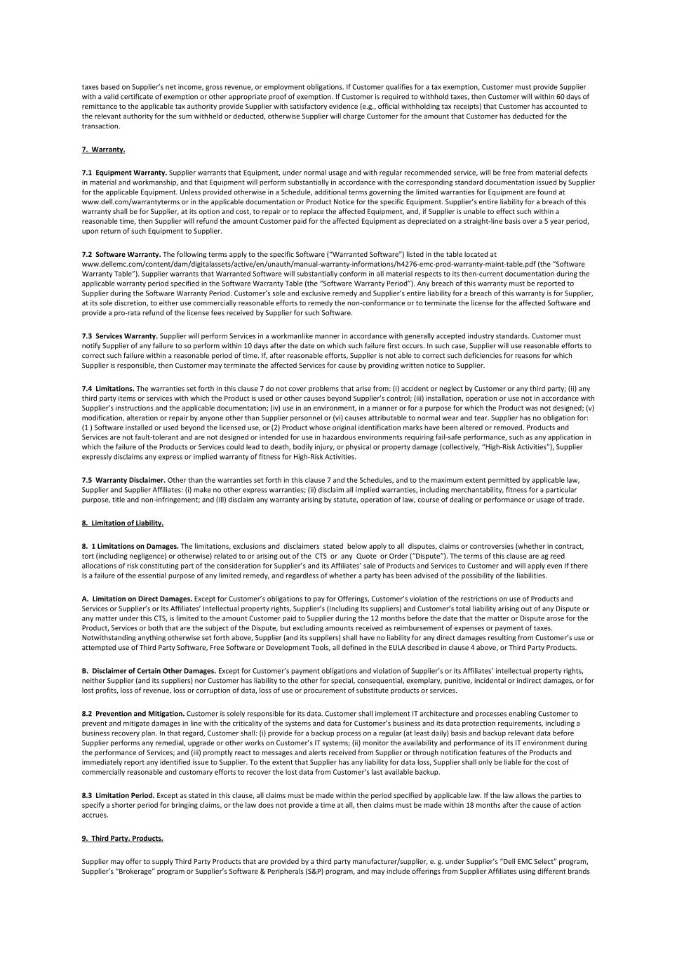taxes based on Supplier’s net income, gross revenue, or employment obligations. If Customer qualifies for a tax exemption, Customer must provide Supplier with a valid certificate of exemption or other appropriate proof of exemption. If Customer is required to withhold taxes, then Customer will within 60 days of remittance to the applicable tax authority provide Supplier with satisfactory evidence (e.g., official withholding tax receipts) that Customer has accounted to the relevant authority for the sum withheld or deducted, otherwise Supplier will charge Customer for the amount that Customer has deducted for the transaction. 7. Warranty. 7.1 Equipment Warranty. Supplier warrants that Equipment, under normal usage and with regular recommended service, will be free from material defects in material and workmanship, and that Equipment will perform substantially in accordance with the corresponding standard documentation issued by Supplier for the applicable Equipment. Unless provided otherwise in a Schedule, additional terms governing the limited warranties for Equipment are found at www.dell.com/warrantyterms or in the applicable documentation or Product Notice for the specific Equipment. Supplier’s entire liability for a breach of this warranty shall be for Supplier, at its option and cost, to repair or to replace the affected Equipment, and, if Supplier is unable to effect such within a reasonable time, then Supplier will refund the amount Customer paid for the affected Equipment as depreciated on a straight-line basis over a 5 year period, upon return of such Equipment to Supplier. 7.2 Software Warranty. The following terms apply to the specific Software (“Warranted Software”) listed in the table located at www.dellemc.com/content/dam/digitalassets/active/en/unauth/manual-warranty-informations/h4276-emc-prod-warranty-maint-table.pdf (the “Software Warranty Table”). Supplier warrants that Warranted Software will substantially conform in all material respects to its then-current documentation during the applicable warranty period specified in the Software Warranty Table (the “Software Warranty Period”). Any breach of this warranty must be reported to Supplier during the Software Warranty Period. Customer’s sole and exclusive remedy and Supplier’s entire liability for a breach of this warranty is for Supplier, at its sole discretion, to either use commercially reasonable efforts to remedy the non-conformance or to terminate the license for the affected Software and provide a pro-rata refund of the license fees received by Supplier for such Software. 7.3 Services Warranty. Supplier will perform Services in a workmanlike manner in accordance with generally accepted industry standards. Customer must notify Supplier of any failure to so perform within 10 days after the date on which such failure first occurs. In such case, Supplier will use reasonable efforts to correct such failure within a reasonable period of time. If, after reasonable efforts, Supplier is not able to correct such deficiencies for reasons for which Supplier is responsible, then Customer may terminate the affected Services for cause by providing written notice to Supplier. 7.4 Limitations. The warranties set forth in this clause 7 do not cover problems that arise from: (i) accident or neglect by Customer or any third party; (ii) any third party items or services with which the Product is used or other causes beyond Supplier’s control; (iii) installation, operation or use not in accordance with Supplier’s instructions and the applicable documentation; (iv) use in an environment, in a manner or for a purpose for which the Product was not designed; (v) modification, alteration or repair by anyone other than Supplier personnel or (vi) causes attributable to normal wear and tear. Supplier has no obligation for: (1 ) Software installed or used beyond the licensed use, or (2) Product whose original identification marks have been altered or removed. Products and Services are not fault-tolerant and are not designed or intended for use in hazardous environments requiring fail-safe performance, such as any application in which the failure of the Products or Services could lead to death, bodily injury, or physical or property damage (collectively, “High-Risk Activities”), Supplier expressly disclaims any express or implied warranty of fitness for High-Risk Activities. 7.5 Warranty Disclaimer. Other than the warranties set forth in this clause 7 and the Schedules, and to the maximum extent permitted by applicable law, Supplier and Supplier Affiliates: (i) make no other express warranties; (ii) disclaim all implied warranties, including merchantability, fitness for a particular purpose, title and non-infringement; and (Ill) disclaim any warranty arising by statute, operation of law, course of dealing or performance or usage of trade. 8. Limitation of Liability. 8. 1 Limitations on Damages. The limitations, exclusions and disclaimers stated below apply to all disputes, claims or controversies (whether in contract, tort (including negligence) or otherwise) related to or arising out of the CTS or any Quote or Order (“Dispute”). The terms of this clause are ag reed allocations of risk constituting part of the consideration for Supplier’s and its Affiliates’ sale of Products and Services to Customer and will apply even If there Is a failure of the essential purpose of any limited remedy, and regardless of whether a party has been advised of the possibility of the liabilities. A. Limitation on Direct Damages. Except for Customer’s obligations to pay for Offerings, Customer’s violation of the restrictions on use of Products and Services or Supplier’s or Its Affiliates’ Intellectual property rights, Supplier’s (Including Its suppliers) and Customer’s total liability arising out of any Dispute or any matter under this CTS, is limited to the amount Customer paid to Supplier during the 12 months before