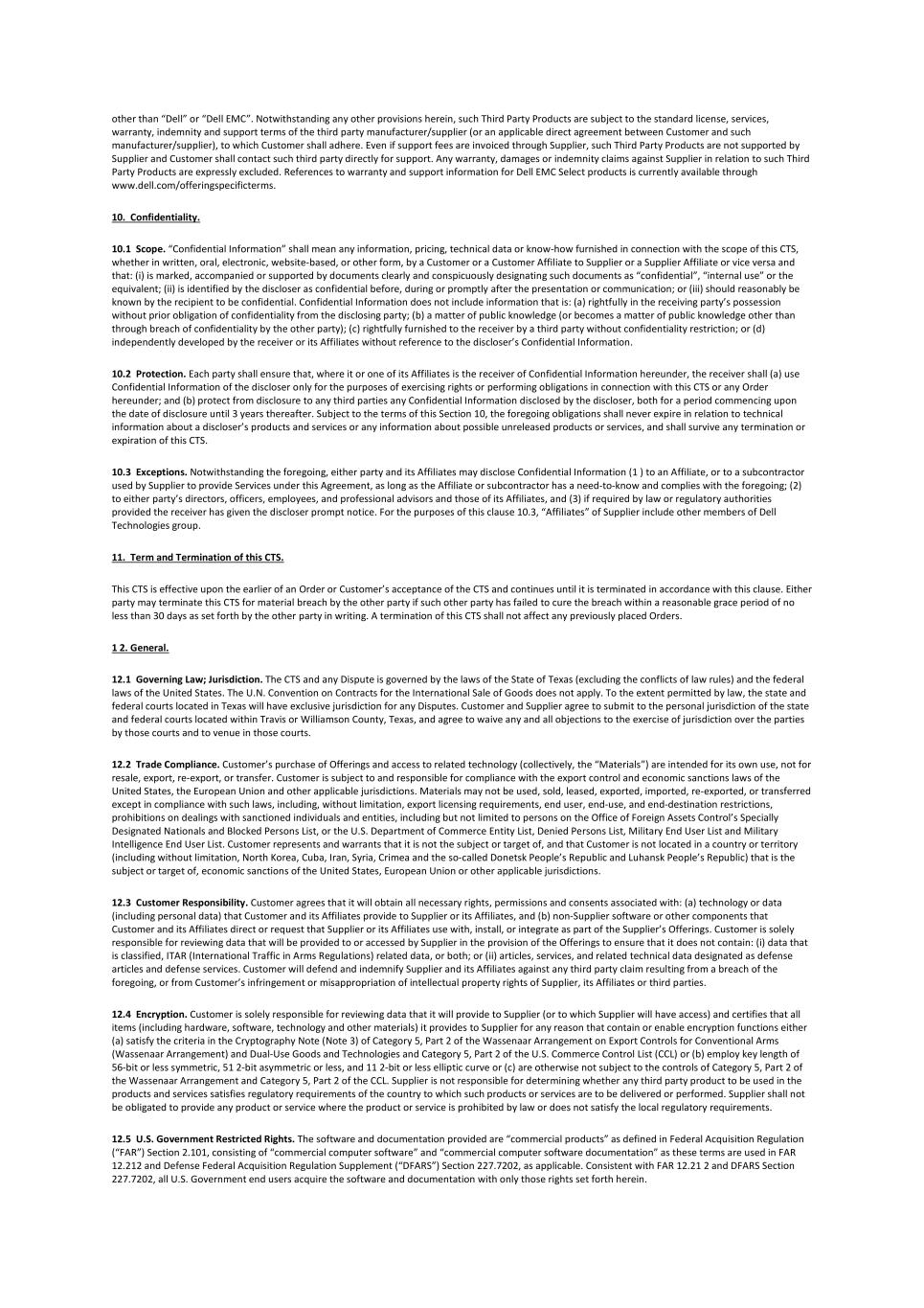 other than “Dell” or “Dell EMC”. Notwithstanding any other provisions herein, such Third Party Products are subject to the standard license, services, warranty, indemnity and support terms of the third party manufacturer/supplier (or an applicable direct agreement between Customer and such manufacturer/supplier), to which Customer shall adhere. Even if support fees are invoiced through Supplier, such Third Party Products are not supported by Supplier and Customer shall contact such third party directly for support. Any warranty, damages or indemnity claims against Supplier in relation to such Third Party Products are expressly excluded. References to warranty and support information for Dell EMC Select products is currently available through www.dell.com/offeringspecificterms. 10. Confidentiality. 10.1 Scope. “Confidential Information” shall mean any information, pricing, technical data or know-how furnished in connection with the scope of this CTS, whether in written, oral, electronic, website-based, or other form, by a Customer or a Customer Affiliate to Supplier or a Supplier Affiliate or vice versa and that: (i) is marked, accompanied or supported by documents clearly and conspicuously designating such documents as “confidential”, “internal use” or the equivalent; (ii) is identified by the discloser as confidential before, during or promptly after the presentation or communication; or (iii) should reasonably be known by the recipient to be confidential. Confidential Information does not include information that is: (a) rightfully in the receiving party’s possession without prior obligation of confidentiality from the disclosing party; (b) a matter of public knowledge (or becomes a matter of public knowledge other than through breach of confidentiality by the other party); (c) rightfully furnished to the receiver by a third party without confidentiality restriction; or (d) independently developed by the receiver or its Affiliates without reference to the discloser’s Confidential Information. 10.2 Protection. Each party shall ensure that, where it or one of its Affiliates is the receiver of Confidential Information hereunder, the receiver shall (a) use Confidential Information of the discloser only for the purposes of exercising rights or performing obligations in connection with this CTS or any Order hereunder; and (b) protect from disclosure to any third parties any Confidential Information disclosed by the discloser, both for a period commencing upon the date of disclosure until 3 years thereafter. Subject to the terms of this Section 10, the foregoing obligations shall never expire in relation to technical information about a discloser’s products and services or any information about possible unreleased products or services, and shall survive any termination or expiration of this CTS. 10.3 Exceptions. Notwithstanding the foregoing, either party and its Affiliates may disclose Confidential Information (1 ) to an Affiliate, or to a subcontractor used by Supplier to provide Services under this Agreement, as long as the Affiliate or subcontractor has a need-to-know and complies with the foregoing; (2) to either party’s directors, officers, employees, and professional advisors and those of its Affiliates, and (3) if required by law or regulatory authorities provided the receiver has given the discloser prompt notice. For the purposes of this clause 10.3, “Affiliates” of Supplier include other members of Dell Technologies group. 11. Term and Termination of this CTS. This CTS is effective upon the earlier of an Order or Customer’s acceptance of the CTS and continues until it is terminated in accordance with this clause. Either party may terminate this CTS for material breach by the other party if such other party has failed to cure the breach within a reasonable grace period of no less than 30 days as set forth by the other party in writing. A termination of this CTS shall not affect any previously placed Orders. 1 2. General. 12.1 Governing Law; Jurisdiction. The CTS and any Dispute is governed by the laws of the State of Texas (excluding the conflicts of law rules) and the federal laws of the United States. The U.N. Convention on Contracts for the International Sale of Goods does not apply. To the extent permitted by law, the state and federal courts located in Texas will have exclusive jurisdiction for any Disputes. Customer and Supplier agree to submit to the personal jurisdiction of the state and federal courts located within Travis or Williamson County, Texas, and agree to waive any and all objections to the exercise of jurisdiction over the parties by those courts and to venue in those courts. 12.2 Trade Compliance. Customer’s purchase of Offerings and access to related technology (collectively, the “Materials”) are intended for its own use, not for resale, export, re-export, or transfer. Customer is subject to and responsible for compliance with the export control and economic sanctions laws of the United States, the European Union and other applicable jurisdictions. Materials may not be used, sold, leased, exported, imported, re-exported, or transferred except in compliance with such laws, including, without limitation, export licensing requirements, end user, end-use, and end-destination restrictions, prohibitions on dealings with sanctioned individuals and entities, including but not limited to persons on the Office of Foreign Assets Control’s Specially Designated Nationals and Blocked Persons List, or the U.S. Department of Commerce Entity List, Denied Persons List, Military End User List and Military Intelligence End User List. Customer represents and warrants that it is not the subject or target of, and that Customer is not located in a country or territory (including without limitation, North Korea, Cuba, Iran, Syria, Crimea and the so-called Donetsk People’s Republic and Luhansk People’s Republic) that is the subject or target 