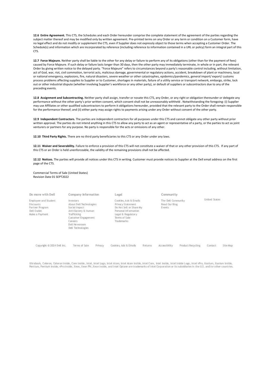 12.6 Entire Agreement. This CTS, the Schedules and each Order hereunder comprise the complete statement of the agreement of the parties regarding the subject matter thereof and may be modified only by written agreement. Pre-printed terms on any Order or any term or condition on a Customer form, have no legal effect and do not modify or supplement the CTS, even if Supplier does not expressly object to those terms when accepting a Customer Order. The Schedule(s) and information which are incorporated by reference (including reference to information contained in a URL or policy) form an integral part of this CTS. 12.7 Force Majeure. Neither party shall be liable to the other for any delay or failure to perform any of its obligations (other than for the payment of fees) caused by Force Majeure. If such delay or failure lasts longer than 30 days, then the other party may immediately terminate, in whole or in part, the relevant Order by giving written notice to the delayed party. “Force Majeure” refers to circumstances beyond a party’s reasonable control including, without limitation, act of God, war, riot, civil commotion, terrorist acts, malicious damage, governmental or regulatory actions, accident, breakdown of plant or machinery, local or national emergency, explosions, fire, natural disasters, severe weather or other catastrophes, epidemics/pandemics, general import/ export/ customs process problems affecting supplies to Supplier or to Customer, shortages in materials, failure of a utility service or transport network, embargo, strike, lock out or other industrial dispute (whether involving Supplier’s workforce or any other party), or default of suppliers or subcontractors due to any of the preceding events. 12.8 Assignment and Subcontracting. Neither party shall assign, transfer or novate this CTS, any Order, or any right or obligation thereunder or delegate any performance without the other party’s prior written consent, which consent shall not be unreasonably withheld . Notwithstanding the foregoing: (i) Supplier may use Affiliates or other qualified subcontractors to perform it obligations hereunder, provided that the relevant party to the Order shall remain responsible for the performance thereof; and (ii) either party may assign rights to payments arising under any Order without consent of the other party. 12.9 Independent Contractors. The parties are independent contractors for all purposes under this CTS and cannot obligate any other party without prior written approval. The parties do not intend anything in this CTS to allow any party to act as an agent or representative of a party, or the parties to act as joint venturers or partners for any purpose. No party is responsible for the acts or omissions of any other. 12.10 Third Party Rights. There are no third party beneficiaries to this CTS or any Order under any laws. 12.11 Waiver and Severability. Failure to enforce a provision of this CTS will not constitute a waiver of that or any other provision of this CTS. If any part of this CTS or an Order is held unenforceable, the validity of the remaining provisions shall not be affected. 12.12 Notices. The parties will provide all notices under this CTS in writing. Customer must provide notices to Supplier at the Dell email address on the first page of the CTS. Commercial Terms of Sale (United States) Revision Date 01 SEPT2022
