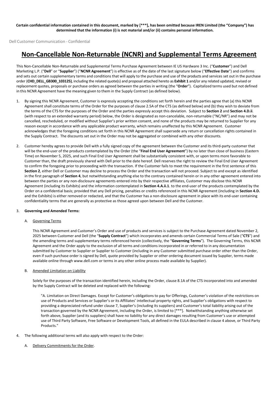 Certain confidential information contained in this document, marked by [***], has been omitted because IREN Limited (the “Company”) has determined that the information (i) is not material and/or (ii) contains personal information. Dell Customer Communication - Confidential Non-Cancellable Non-Returnable (NCNR) and Supplemental Terms Agreement This Non-Cancellable Non-Returnable and Supplemental Terms Purchase Agreement between IE US Hardware 3 Inc. (“Customer”) and Dell Marketing L.P. (“Dell” or “Supplier”) (“NCNR Agreement”) is effective as of the date of the last signature below (“Effective Date”) and confirms and sets out certain supplementary terms and conditions that will apply to the purchase and use of the products and services set out in the purchase order (CHD_DELL_GB300_103125), including the related quote(s) and proposal attached hereto as Exhibit 1 and/or any related updated, revised or replacement quotes, proposals or purchase orders as agreed between the parties in writing (the “Order”). Capitalized terms used but not defined in this NCNR Agreement have the meaning given to them in the Supply Contract (as defined below). 1. By signing this NCNR Agreement, Customer is expressly accepting the conditions set forth herein and the parties agree that (a) this NCNR Agreement shall constitute terms of the Order for the purposes of clause 2.5A of the CTS (as defined below) and (b) they wish to deviate from the terms of the CTS for the purposes of the Order and the parties expressly accept this deviation. Subject to Section 2 and Section 4.D.ii. (with respect to an extended warranty period) below, the Order is designated as non-cancelable, non-returnable (“NC/NR”) and may not be cancelled, rescheduled, or modified without Supplier’s prior written consent, and none of the products may be returned to Supplier for any reason except in accordance with any applicable product warranty, which remains unaffected by this NCNR Agreement. Customer acknowledges that the foregoing conditions set forth in this NCNR Agreement shall supersede any return or cancellation rights contained in the Supply Contract. The discounts set out in the Order may not be aggregated or combined with any other discounts. 2. Customer hereby agrees to provide Dell with a fully signed copy of the agreement between the Customer and its third-party customer that will be the end-user of the products contemplated by the Order (the “Final End User Agreement”) by no later than close of business (Eastern Time) on November 5, 2025, and such Final End User Agreement shall be substantially consistent with, or upon terms more favorable to Customer than, the draft previously shared with Dell prior to the date hereof. Dell reserves the right to review the Final End User Agreement to confirm the foregoing prior to proceeding with the transaction. If the Customer fails to meet the requirement in the first sentence of this Section 2, either Dell or Customer may decline to process the Order and the transaction will not proceed. Subject to and except as identified in the first paragraph of Section 4, but notwithstanding anything else to the contrary contained herein or in any other agreement entered into between the parties or any non-disclosure agreements entered into by their respective affiliates, Customer may disclose this NCNR Agreement (including its Exhibits) and the information contemplated in Section 4.A.ii.1. to the end-user of the products contemplated by the Order on a confidential basis; provided that any Dell pricing, penalties or credits referenced in this NCNR Agreement (including in Section 4.D. and the Exhibits) is either removed or redacted, and that the Customer has a non-disclosure agreement in place with its end-user containing confidentiality terms that are generally as protective as those agreed upon between Dell and the Customer. 3. Governing and Amended Terms: A. Governing Terms This NCNR Agreement and Customer’s Order and use of products and services is subject to the Purchase Agreement dated November 2, 2025 between Customer and Dell (the “Supply Contract”) which incorporates and amends certain Commercial Terms of Sale (“CTS”) and the amending terms and supplementary terms referenced herein (collectively, the “Governing Terms”). The Governing Terms, this NCNR Agreement and the Order apply to the exclusion of all terms and conditions incorporated in or referred to in any documentation submitted by Customer to Supplier or Supplier to Customer (including in any Customer submitted purchase order other than the Order, even if such purchase order is signed by Dell, quote provided by Supplier or other ordering document issued by Supplier, terms made available online through www.dell.com or terms in any other online process made available by Supplier). B. Amended Limitation on Liability Solely for the purposes of the transaction identified herein, including the Order, clause 8.1A of the CTS incorporated into and amended by the Supply Contract will be deleted and replaced with the following: "A. Limitation on Direct Damages. Except for Customer’s obligations to pay for Offerings, Customer’s violation of the restrictions on use of Products and Services or Supplier’s or its Affiliates’ intellectual property rights, and Supplier’s obligations with respect to providing a depreciated refund under clause 7, Supplier’s (including its suppliers) and Customer’s total liability arising out of the transaction governed by the NCNR Agreement, including the Order, is limited to [***]. Notwithstanding anything otherwise set forth above, Supplier (and its suppliers) shall have no liability for any direct damages resulting from Customer’s use or attempted use of Third Party Software, Free Software or Development Tools, all defined in the EULA described in clause 4 above, or Third Party Products." 4. The following additional terms will also apply with respect to the Orde