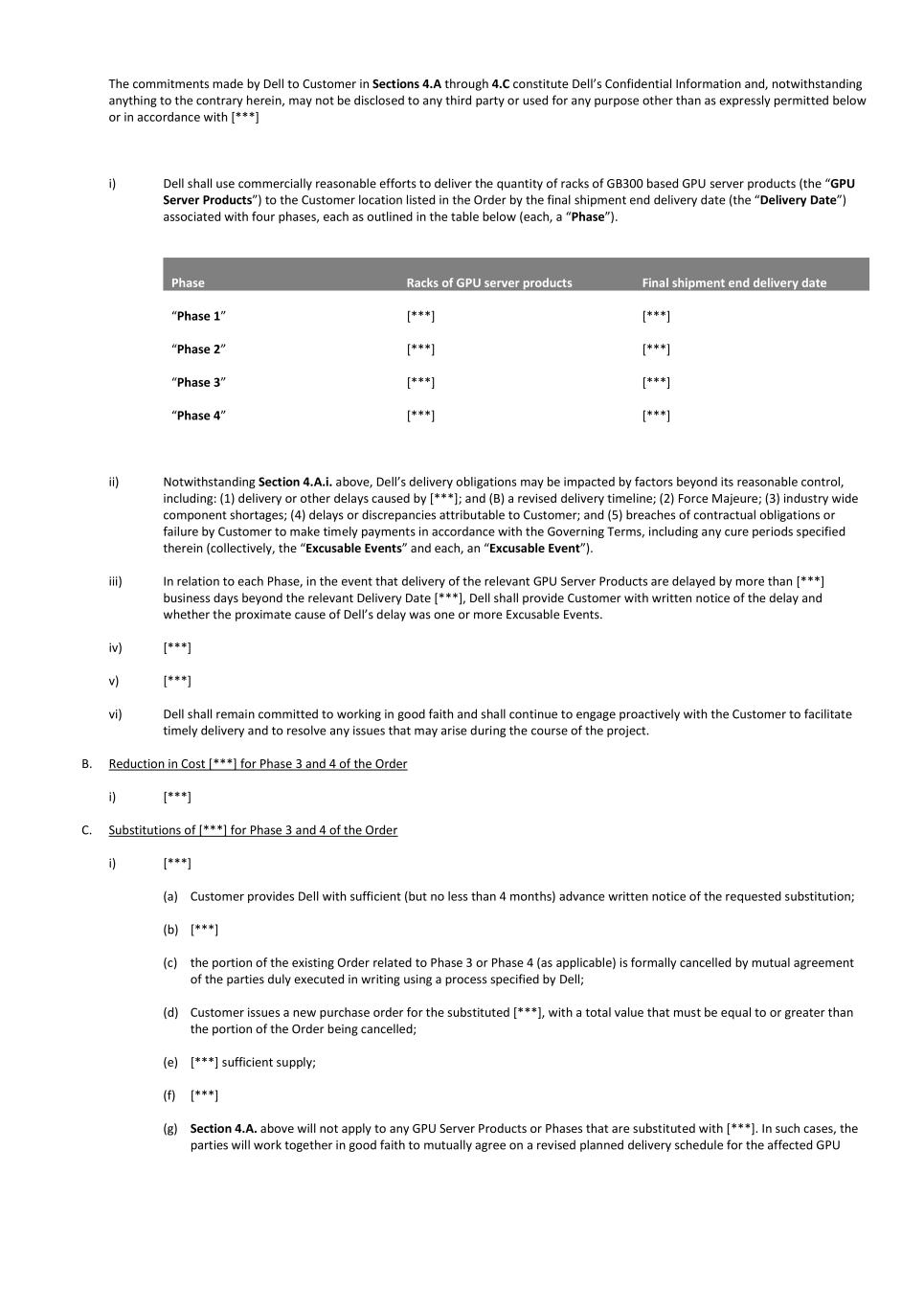The commitments made by Dell to Customer in Sections 4.A through 4.C constitute Dell’s Confidential Information and, notwithstanding anything to the contrary herein, may not be disclosed to any third party or used for any purpose other than as expressly permitted below or in accordance with [***] i) Dell shall use commercially reasonable efforts to deliver the quantity of racks of GB300 based GPU server products (the “GPU Server Products”) to the Customer location listed in the Order by the final shipment end delivery date (the “Delivery Date”) associated with four phases, each as outlined in the table below (each, a “Phase”). Phase Racks of GPU server products Final shipment end delivery date “Phase 1” [***] [***] “Phase 2” [***] [***] “Phase 3” [***] [***] “Phase 4” [***] [***] ii) Notwithstanding Section 4.A.i. above, Dell’s delivery obligations may be impacted by factors beyond its reasonable control, including: (1) delivery or other delays caused by [***]; and (B) a revised delivery timeline; (2) Force Majeure; (3) industry wide component shortages; (4) delays or discrepancies attributable to Customer; and (5) breaches of contractual obligations or failure by Customer to make timely payments in accordance with the Governing Terms, including any cure periods specified therein (collectively, the “Excusable Events” and each, an “Excusable Event”). iii) In relation to each Phase, in the event that delivery of the relevant GPU Server Products are delayed by more than [***] business days beyond the relevant Delivery Date [***], Dell shall provide Customer with written notice of the delay and whether the proximate cause of Dell’s delay was one or more Excusable Events. iv) [***] v) [***] vi) Dell shall remain committed to working in good faith and shall continue to engage proactively with the Customer to facilitate timely delivery and to resolve any issues that may arise during the course of the project. B. Reduction in Cost [***] for Phase 3 and 4 of the Order i) [***] C. Substitutions of [***] for Phase 3 and 4 of the Order i) [***] (a) Customer provides Dell with sufficient (but no less than 4 months) advance written notice of the requested substitution; (b) [***] (c) the portion of the existing Order related to Phase 3 or Phase 4 (as applicable) is formally cancelled by mutual agreement of the parties duly executed in writing using a process specified by Dell; (d) Customer issues a new purchase order for the substituted [***], with a total value that must be equal to or greater than the portion of the Order being cancelled; (e) [***] sufficient supply; (f) [***] (g) Section 4.A. above will not apply to any GPU Server Products or Phases that are substituted with [***]. In such cases, the parties will work together in good faith to mutually agree on a revised planned delivery schedule for the affected GPU