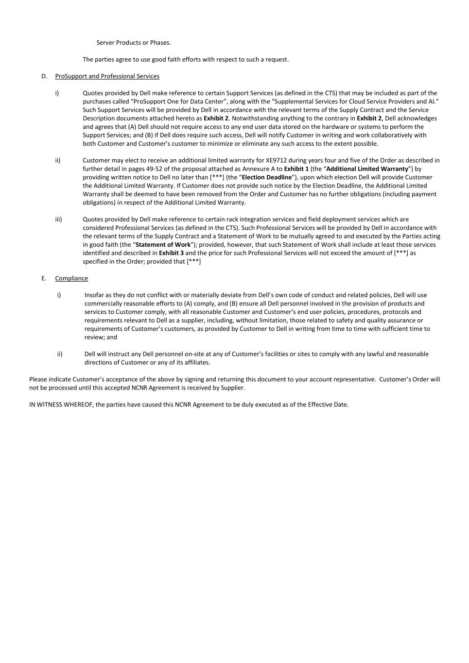 Server Products or Phases. The parties agree to use good faith efforts with respect to such a request. D. ProSupport and Professional Services i) Quotes provided by Dell make reference to certain Support Services (as defined in the CTS) that may be included as part of the purchases called “ProSupport One for Data Center”, along with the “Supplemental Services for Cloud Service Providers and AI.” Such Support Services will be provided by Dell in accordance with the relevant terms of the Supply Contract and the Service Description documents attached hereto as Exhibit 2. Notwithstanding anything to the contrary in Exhibit 2, Dell acknowledges and agrees that (A) Dell should not require access to any end user data stored on the hardware or systems to perform the Support Services; and (B) if Dell does require such access, Dell will notify Customer in writing and work collaboratively with both Customer and Customer’s customer to minimize or eliminate any such access to the extent possible. ii) Customer may elect to receive an additional limited warranty for XE9712 during years four and five of the Order as described in further detail in pages 49-52 of the proposal attached as Annexure A to Exhibit 1 (the “Additional Limited Warranty”) by providing written notice to Dell no later than [***] (the “Election Deadline”), upon which election Dell will provide Customer the Additional Limited Warranty. If Customer does not provide such notice by the Election Deadline, the Additional Limited Warranty shall be deemed to have been removed from the Order and Customer has no further obligations (including payment obligations) in respect of the Additional Limited Warranty. iii) Quotes provided by Dell make reference to certain rack integration services and field deployment services which are considered Professional Services (as defined in the CTS). Such Professional Services will be provided by Dell in accordance with the relevant terms of the Supply Contract and a Statement of Work to be mutually agreed to and executed by the Parties acting in good faith (the “Statement of Work”); provided, however, that such Statement of Work shall include at least those services identified and described in Exhibit 3 and the price for such Professional Services will not exceed the amount of [***] as specified in the Order; provided that [***] E. Compliance i) Insofar as they do not conflict with or materially deviate from Dell’s own code of conduct and related policies, Dell will use commercially reasonable efforts to (A) comply, and (B) ensure all Dell personnel involved in the provision of products and services to Customer comply, with all reasonable Customer and Customer’s end user policies, procedures, protocols and requirements relevant to Dell as a supplier, including, without limitation, those related to safety and quality assurance or requirements of Customer’s customers, as provided by Customer to Dell in writing from time to time with sufficient time to review; and ii) Dell will instruct any Dell personnel on-site at any of Customer’s facilities or sites to comply with any lawful and reasonable directions of Customer or any of its affiliates. Please indicate Customer’s acceptance of the above by signing and returning this document to your account representative. Customer’s Order will not be processed until this accepted NCNR Agreement is received by Supplier. IN WITNESS WHEREOF, the parties have caused this NCNR Agreement to be duly executed as of the Effective Date.