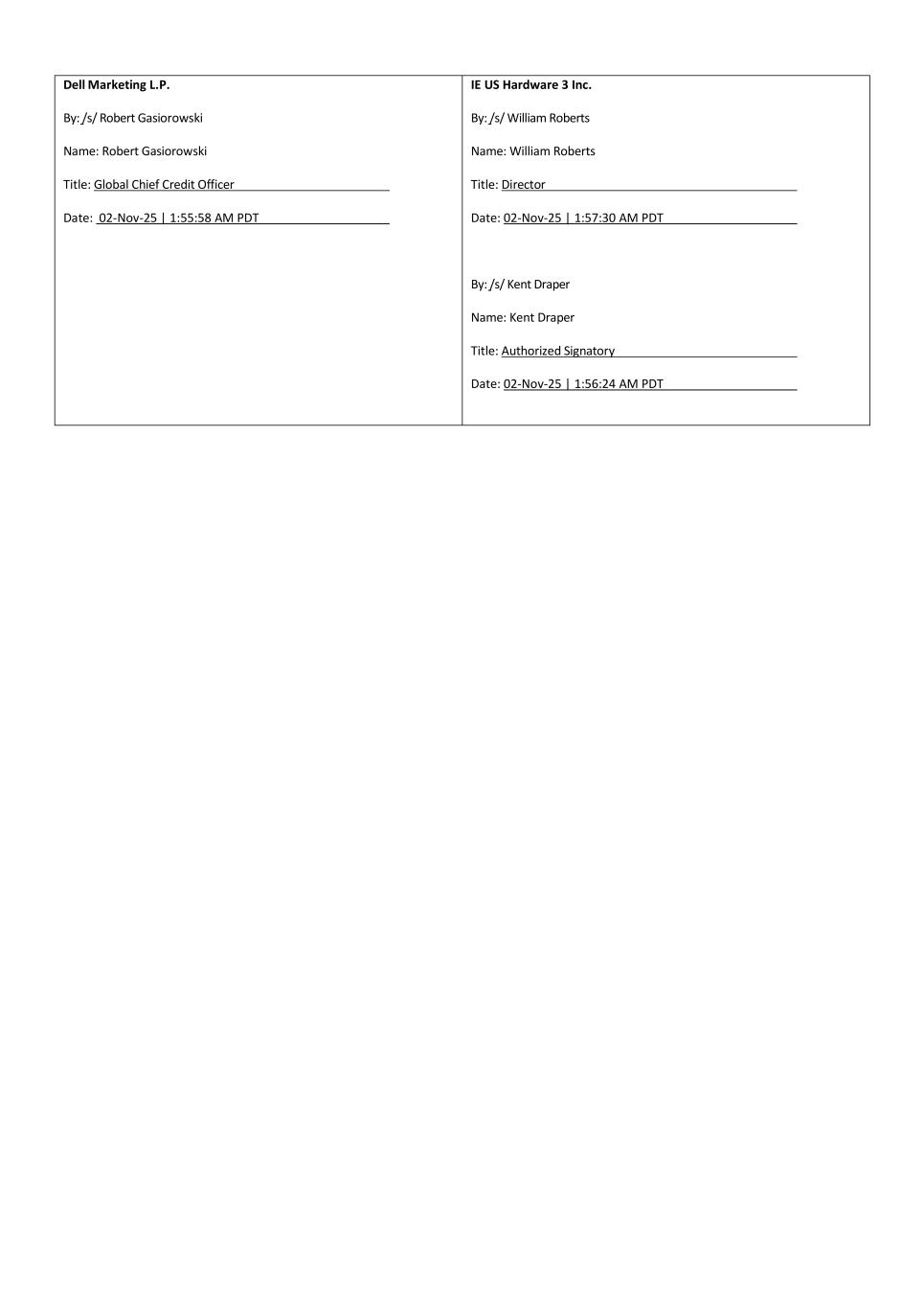 Dell Marketing L.P. By: /s/ Robert Gasiorowski Name: Robert Gasiorowski Title: Global Chief Credit Officer Date: 02-Nov-25 | 1:55:58 AM PDT IE US Hardware 3 Inc. By: /s/ William Roberts Name: William Roberts Title: Director Date: 02-Nov-25 | 1:57:30 AM PDT By: /s/ Kent Draper Name: Kent Draper Title: Authorized Signatory Date: 02-Nov-25 | 1:56:24 AM PDT