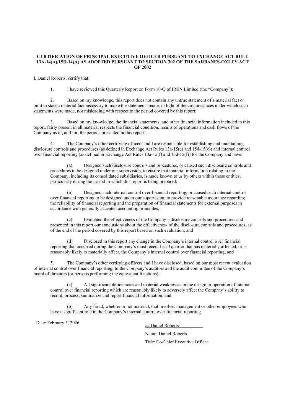 CERTIFICATION OF PRINCIPAL EXECUTIVE OFFICER PURSUANT TO EXCHANGE ACT RULE 13A-14(A)/15D-14(A) AS ADOPTED PURSUANT TO SECTION 302 OF THE SARBANES-OXLEY ACT OF 2002 I, Daniel Roberts, certify that: 1. I have reviewed this Quarterly Report on Form 10-Q of IREN Limited (the “Company”); 2. Based on my knowledge, this report does not contain any untrue statement of a material fact or omit to state a material fact necessary to make the statements made, in light of the circumstances under which such statements were made, not misleading with respect to the period covered by this report; 3. Based on my knowledge, the financial statements, and other financial information included in this report, fairly present in all material respects the financial condition, results of operations and cash flows of the Company as of, and for, the periods presented in this report; 4. The Company’s other certifying officers and I are responsible for establishing and maintaining disclosure controls and procedures (as defined in Exchange Act Rules 13a-15(e) and 15d-15(e)) and internal control over financial reporting (as defined in Exchange Act Rules 13a-15(f) and 15d-15(f)) for the Company and have: (a) Designed such disclosure controls and procedures, or caused such disclosure controls and procedures to be designed under our supervision, to ensure that material information relating to the Company, including its consolidated subsidiaries, is made known to us by others within those entities, particularly during the period in which this report is being prepared; (b) Designed such internal control over financial reporting, or caused such internal control over financial reporting to be designed under our supervision, to provide reasonable assurance regarding the reliability of financial reporting and the preparation of financial statements for external purposes in accordance with generally accepted accounting principles; (c) Evaluated the effectiveness of the Company’s disclosure controls and procedures and presented in this report our conclusions about the effectiveness of the disclosure controls and procedures, as of the end of the period covered by this report based on such evaluation; and (d) Disclosed in this report any change in the Company’s internal control over financial reporting that occurred during the Company’s most recent fiscal quarter that has materially affected, or is reasonably likely to materially affect, the Company’s internal control over financial reporting; and 5. The Company’s other certifying officers and I have disclosed, based on our most recent evaluation of internal control over financial reporting, to the Company’s auditors and the audit committee of the Company’s board of directors (or persons performing the equivalent functions): (a) All significant deficiencies and material weaknesses in the design or operation of internal control over financial reporting which are reasonably likely to adversely affect the Company’s ability to record, process, summarize and report financial information; and (b) Any fraud, whether or not material, that involves management or other employees who have a significant role in the Company’s internal control over financial reporting. Date: February 5, 2026 /s/ Daniel Roberts . Name: Daniel Roberts Title: Co-Chief Executive Officer