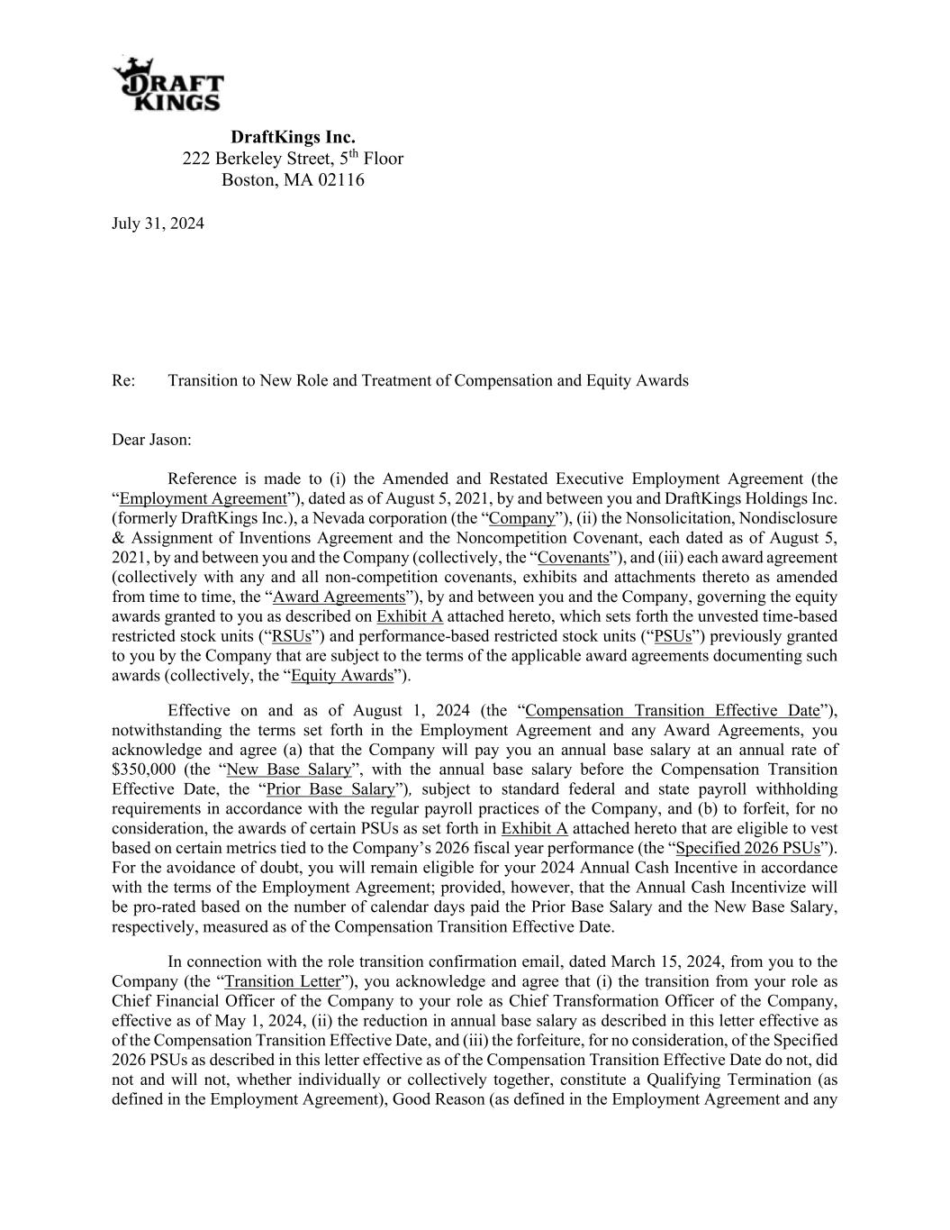 DraftKings Inc. 222 Berkeley Street, 5th Floor Boston, MA 02116 July 31, 2024 Re: Transition to New Role and Treatment of Compensation and Equity Awards Dear Jason: Reference is made to (i) the Amended and Restated Executive Employment Agreement (the “Employment Agreement”), dated as of August 5, 2021, by and between you and DraftKings Holdings Inc. (formerly DraftKings Inc.), a Nevada corporation (the “Company”), (ii) the Nonsolicitation, Nondisclosure & Assignment of Inventions Agreement and the Noncompetition Covenant, each dated as of August 5, 2021, by and between you and the Company (collectively, the “Covenants”), and (iii) each award agreement (collectively with any and all non-competition covenants, exhibits and attachments thereto as amended from time to time, the “Award Agreements”), by and between you and the Company, governing the equity awards granted to you as described on Exhibit A attached hereto, which sets forth the unvested time-based restricted stock units (“RSUs”) and performance-based restricted stock units (“PSUs”) previously granted to you by the Company that are subject to the terms of the applicable award agreements documenting such awards (collectively, the “Equity Awards”). Effective on and as of August 1, 2024 (the “Compensation Transition Effective Date”), notwithstanding the terms set forth in the Employment Agreement and any Award Agreements, you acknowledge and agree (a) that the Company will pay you an annual base salary at an annual rate of $350,000 (the “New Base Salary”, with the annual base salary before the Compensation Transition Effective Date, the “Prior Base Salary”), subject to standard federal and state payroll withholding requirements in accordance with the regular payroll practices of the Company, and (b) to forfeit, for no consideration, the awards of certain PSUs as set forth in Exhibit A attached hereto that are eligible to vest based on certain metrics tied to the Company’s 2026 fiscal year performance (the “Specified 2026 PSUs”). For the avoidance of doubt, you will remain eligible for your 2024 Annual Cash Incentive in accordance with the terms of the Employment Agreement; provided, however, that the Annual Cash Incentivize will be pro-rated based on the number of calendar days paid the Prior Base Salary and the New Base Salary, respectively, measured as of the Compensation Transition Effective Date. In connection with the role transition confirmation email, dated March 15, 2024, from you to the Company (the “Transition Letter”), you acknowledge and agree that (i) the transition from your role as Chief Financial Officer of the Company to your role as Chief Transformation Officer of the Company, effective as of May 1, 2024, (ii) the reduction in annual base salary as described in this letter effective as of the Compensation Transition Effective Date, and (iii) the forfeiture, for no consideration, of the Specified 2026 PSUs as described in this letter effective as of the Compensation Transition Effective Date do not, did not and will not, whether individually or collectively together, constitute a Qualifying Termination (as defined in the Employment Agreement), Good Reason (as defined in the Employment Agreement and any