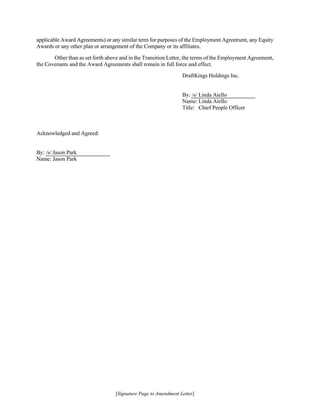 [Signature Page to Amendment Letter] applicable Award Agreements) or any similar term for purposes of the Employment Agreement, any Equity Awards or any other plan or arrangement of the Company or its affiliates. Other than as set forth above and in the Transition Letter, the terms of the Employment Agreement, the Covenants and the Award Agreements shall remain in full force and effect. DraftKings Holdings Inc. By: /s/ Linda Aiello Name: Linda Aiello Title: Chief People Officer Acknowledged and Agreed: By: /s/ Jason Park Name: Jason Park