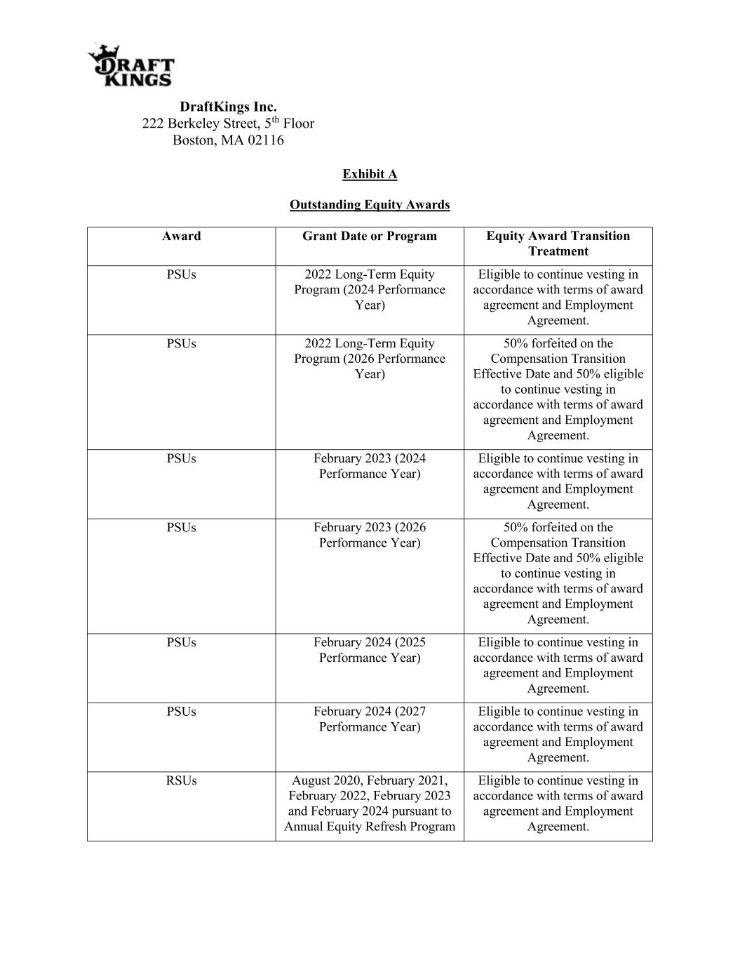 DraftKings Inc. 222 Berkeley Street, 5th Floor Boston, MA 02116 Exhibit A Outstanding Equity Awards Award Grant Date or Program Equity Award Transition Treatment PSUs 2022 Long-Term Equity Program (2024 Performance Year) Eligible to continue vesting in accordance with terms of award agreement and Employment Agreement. PSUs 2022 Long-Term Equity Program (2026 Performance Year) 50% forfeited on the Compensation Transition Effective Date and 50% eligible to continue vesting in accordance with terms of award agreement and Employment Agreement. PSUs February 2023 (2024 Performance Year) Eligible to continue vesting in accordance with terms of award agreement and Employment Agreement. PSUs February 2023 (2026 Performance Year) 50% forfeited on the Compensation Transition Effective Date and 50% eligible to continue vesting in accordance with terms of award agreement and Employment Agreement. PSUs February 2024 (2025 Performance Year) Eligible to continue vesting in accordance with terms of award agreement and Employment Agreement. PSUs February 2024 (2027 Performance Year) Eligible to continue vesting in accordance with terms of award agreement and Employment Agreement. RSUs August 2020, February 2021, February 2022, February 2023 and February 2024 pursuant to Annual Equity Refresh Program Eligible to continue vesting in accordance with terms of award agreement and Employment Agreement.