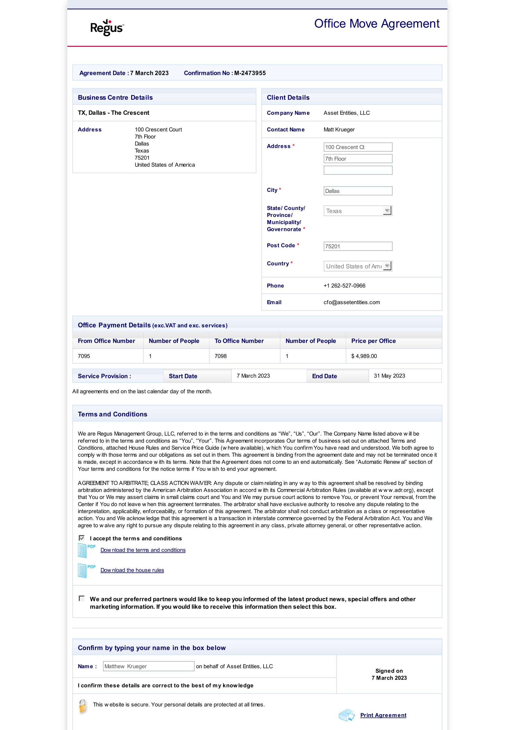 EX-10.3 2 f10q0623ex10-3_assetent.htm OFFICE MOVE AGREEMENT BETWEEN REGUS MANAGEMENT GROUP, LLC AND ASSET ENTITIES, LLC, DATED AS OF MARCH 7, 2023