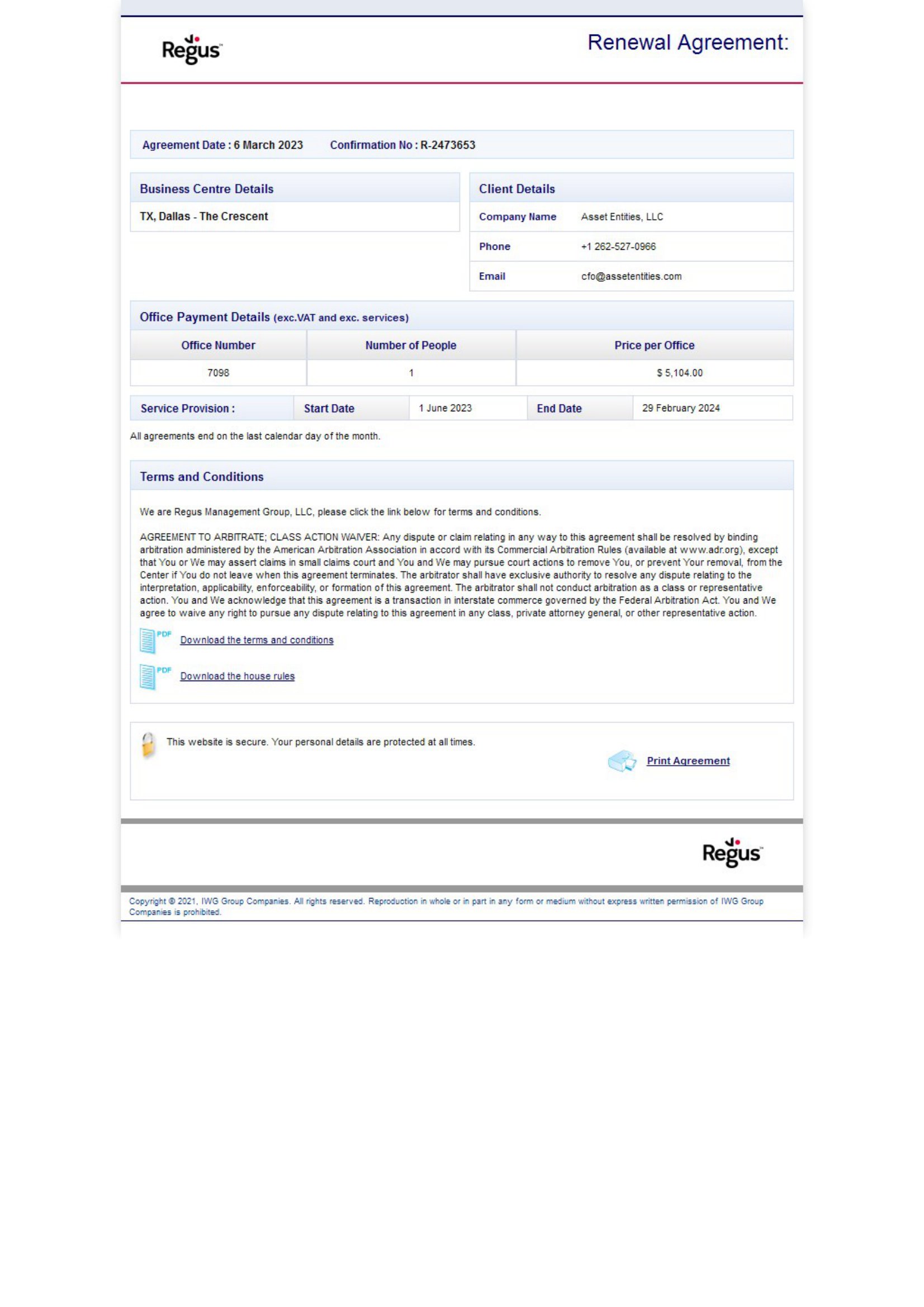 EX-10.4 3 f10q0623ex10-4_assetent.htm RENEWAL AGREEMENT BETWEEN REGUS MANAGEMENT GROUP, LLC AND ASSET ENTITIES, LLC, DATED AS OF MARCH 6, 2023