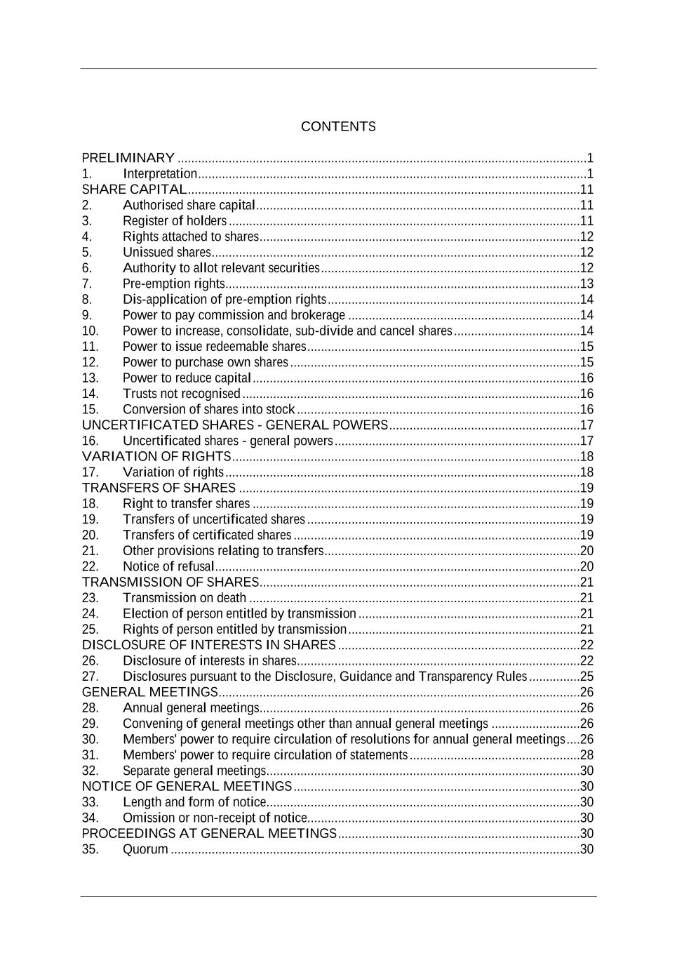 CONTENTS PRELIMINARY ........................................................................................................................1 1. Interpretation ..................................................................................................................1 SHARE CAPITAL...................................................................................................................11 2. Authorised share capital ...............................................................................................11 3. Register of holders .......................................................................................................11 4. Rights attached to shares ..............................................................................................12 5. Unissued shares ............................................................................................................12 6. Authority to allot relevant securities ............................................................................12 7. Pre-emption rights ........................................................................................................13 8. Dis-application of pre-emption rights ..........................................................................14 9. Power to pay commission and brokerage ....................................................................14 10. Power to increase, consolidate, sub-divide and cancel shares .....................................14 11. Power to issue redeemable shares ................................................................................15 12. Power to purchase own shares .....................................................................................15 13. Power to reduce capital ................................................................................................16 14. Trusts not recognised ...................................................................................................16 15. Conversion of shares into stock ...................................................................................16 UNCERTIFICATED SHARES - GENERAL POWERS ........................................................17 16. Uncertificated shares - general powers ........................................................................17 VARIATION OF RIGHTS ......................................................................................................18 17. Variation of rights ........................................................................................................18 TRANSFERS OF SHARES ....................................................................................................19 18. Right to transfer shares ................................................................................................19 19. Transfers of uncertificated shares ................................................................................19 20. Transfers of certificated shares ....................................................................................19 21. Other provisions relating to transfers ...........................................................................20 22. Notice of refusal ...........................................................................................................20 TRANSMISSION OF SHARES..............................................................................................21 23. Transmission on death .................................................................................................21 24. Election of person entitled by transmission .................................................................21 25. Rights of person entitled by transmission ....................................................................21 DISCLOSURE OF INTERESTS IN SHARES .......................................................................22 26. Disclosure of interests in shares ...................................................................................22 27. Disclosures pursuant to the Disclosure, Guidance and Transparency Rules ...............25 GENERAL MEETINGS ..........................................................................................................26 28. Annual general meetings..............................................................................................26 29. Convening of general meetings other than annual general meetings ..........................26 30. Members' power to require circulation of resolutions for annual general meetings ....26 31. Members' power to require circulation of statements ..................................................28 32. Separate general meetings............................................................................................30 NOTICE OF GENERAL MEETINGS ....................................................................................30 33. Length and form of notice............................................................................................30 34. Omission or non-receipt of notice................................................................................30 PROCEEDINGS AT GENERAL MEETINGS .......................................................................30 35. Quorum ........................................................................................................................30