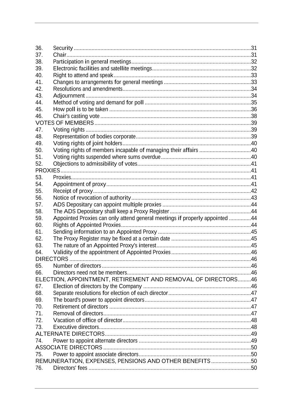 36. Security ........................................................................................................................31 37. Chair .............................................................................................................................31 38. Participation in general meetings .................................................................................32 39. Electronic facilities and satellite meetings ...................................................................32 40. Right to attend and speak .............................................................................................33 41. Changes to arrangements for general meetings ...........................................................33 42. Resolutions and amendments .......................................................................................34 43. Adjournment ................................................................................................................34 44. Method of voting and demand for poll ........................................................................35 45. How poll is to be taken ................................................................................................36 46. Chair's casting vote ......................................................................................................38 VOTES OF MEMBERS ..........................................................................................................39 47. Voting rights ................................................................................................................39 48. Representation of bodies corporate ..............................................................................39 49. Voting rights of joint holders .......................................................................................40 50. Voting rights of members incapable of managing their affairs ...................................40 51. Voting rights suspended where sums overdue .............................................................40 52. Objections to admissibility of votes .............................................................................41 PROXIES .................................................................................................................................41 53. Proxies..........................................................................................................................41 54. Appointment of proxy ..................................................................................................41 55. Receipt of proxy ...........................................................................................................42 56. Notice of revocation of authority .................................................................................43 57. ADS Depositary can appoint multiple proxies ............................................................44 58. The ADS Depositary shall keep a Proxy Register .......................................................44 59. Appointed Proxies can only attend general meetings if properly appointed ...............44 60. Rights of Appointed Proxies ........................................................................................44 61. Sending information to an Appointed Proxy ...............................................................45 62. The Proxy Register may be fixed at a certain date ......................................................45 63. The nature of an Appointed Proxy's interest ................................................................45 64. Validity of the appointment of Appointed Proxies ......................................................46 DIRECTORS ...........................................................................................................................46 65. Number of directors .....................................................................................................46 66. Directors need not be members....................................................................................46 ELECTION, APPOINTMENT, RETIREMENT AND REMOVAL OF DIRECTORS .........46 67. Election of directors by the Company .........................................................................46 68. Separate resolutions for election of each director ........................................................47 69. The board's power to appoint directors ........................................................................47 70. Retirement of directors ................................................................................................47 71. Removal of directors ....................................................................................................47 72. Vacation of office of director .......................................................................................48 73. Executive directors.......................................................................................................48 ALTERNATE DIRECTORS ...................................................................................................49 74. Power to appoint alternate directors ............................................................................49 ASSOCIATE DIRECTORS ....................................................................................................50 75. Power to appoint associate directors ............................................................................50 REMUNERATION, EXPENSES, PENSIONS AND OTHER BENEFITS ...........................50 76. Directors' fees ..............................................................................................................50