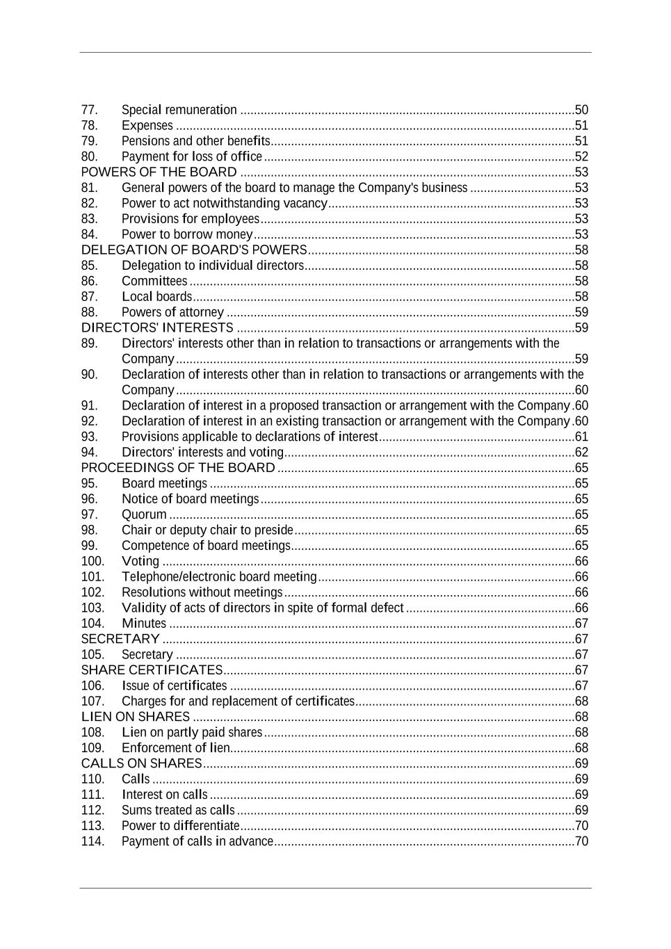 77. Special remuneration ...................................................................................................50 78. Expenses ......................................................................................................................51 79. Pensions and other benefits ..........................................................................................51 80. Payment for loss of office ............................................................................................52 POWERS OF THE BOARD ...................................................................................................53 81. General powers of the board to manage the Company's business ...............................53 82. Power to act notwithstanding vacancy .........................................................................53 83. Provisions for employees .............................................................................................53 84. Power to borrow money ...............................................................................................53 DELEGATION OF BOARD'S POWERS ...............................................................................58 85. Delegation to individual directors ................................................................................58 86. Committees ..................................................................................................................58 87. Local boards .................................................................................................................58 88. Powers of attorney .......................................................................................................59 DIRECTORS' INTERESTS ....................................................................................................59 89. Directors' interests other than in relation to transactions or arrangements with the Company ......................................................................................................................59 90. Declaration of interests other than in relation to transactions or arrangements with the Company ......................................................................................................................60 91. Declaration of interest in a proposed transaction or arrangement with the Company .60 92. Declaration of interest in an existing transaction or arrangement with the Company .60 93. Provisions applicable to declarations of interest ..........................................................61 94. Directors' interests and voting ......................................................................................62 PROCEEDINGS OF THE BOARD ........................................................................................65 95. Board meetings ............................................................................................................65 96. Notice of board meetings .............................................................................................65 97. Quorum ........................................................................................................................65 98. Chair or deputy chair to preside ...................................................................................65 99. Competence of board meetings ....................................................................................65 100. Voting ..........................................................................................................................66 101. Telephone/electronic board meeting ............................................................................66 102. Resolutions without meetings ......................................................................................66 103. Validity of acts of directors in spite of formal defect ..................................................66 104. Minutes ........................................................................................................................67 SECRETARY ..........................................................................................................................67 105. Secretary ......................................................................................................................67 SHARE CERTIFICATES ........................................................................................................67 106. Issue of certificates ......................................................................................................67 107. Charges for and replacement of certificates .................................................................68 LIEN ON SHARES .................................................................................................................68 108. Lien on partly paid shares ............................................................................................68 109. Enforcement of lien......................................................................................................68 CALLS ON SHARES ..............................................................................................................69 110. Calls .............................................................................................................................69 111. Interest on calls ............................................................................................................69 112. Sums treated as calls ....................................................................................................69 113. Power to differentiate ...................................................................................................70 114. Payment of calls in advance .........................................................................................70