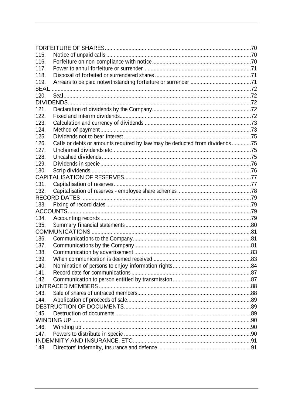 FORFEITURE OF SHARES ...................................................................................................70 115. Notice of unpaid calls ..................................................................................................70 116. Forfeiture on non-compliance with notice ...................................................................70 117. Power to annul forfeiture or surrender .........................................................................71 118. Disposal of forfeited or surrendered shares .................................................................71 119. Arrears to be paid notwithstanding forfeiture or surrender .........................................71 SEAL........................................................................................................................................72 120. Seal ...............................................................................................................................72 DIVIDENDS ............................................................................................................................72 121. Declaration of dividends by the Company...................................................................72 122. Fixed and interim dividends.........................................................................................72 123. Calculation and currency of dividends ........................................................................73 124. Method of payment ......................................................................................................73 125. Dividends not to bear interest ......................................................................................75 126. Calls or debts or amounts required by law may be deducted from dividends .............75 127. Unclaimed dividends etc ..............................................................................................75 128. Uncashed dividends .....................................................................................................75 129. Dividends in specie ......................................................................................................76 130. Scrip dividends.............................................................................................................76 CAPITALISATION OF RESERVES......................................................................................77 131. Capitalisation of reserves .............................................................................................77 132. Capitalisation of reserves - employee share schemes ..................................................78 RECORD DATES ...................................................................................................................79 133. Fixing of record dates ..................................................................................................79 ACCOUNTS ............................................................................................................................79 134. Accounting records ......................................................................................................79 135. Summary financial statements .....................................................................................80 COMMUNICATIONS ............................................................................................................81 136. Communications to the Company ................................................................................81 137. Communications by the Company ...............................................................................81 138. Communication by advertisement ...............................................................................83 139. When communication is deemed received ..................................................................83 140. Nomination of persons to enjoy information rights .....................................................84 141. Record date for communications .................................................................................87 142. Communication to person entitled by transmission .....................................................87 UNTRACED MEMBERS .......................................................................................................88 143. Sale of shares of untraced members.............................................................................88 144. Application of proceeds of sale....................................................................................89 DESTRUCTION OF DOCUMENTS ......................................................................................89 145. Destruction of documents ............................................................................................89 WINDING UP .........................................................................................................................90 146. Winding up...................................................................................................................90 147. Powers to distribute in specie ......................................................................................90 INDEMNITY AND INSURANCE, ETC ................................................................................91 148. Directors' indemnity, insurance and defence ...............................................................91
