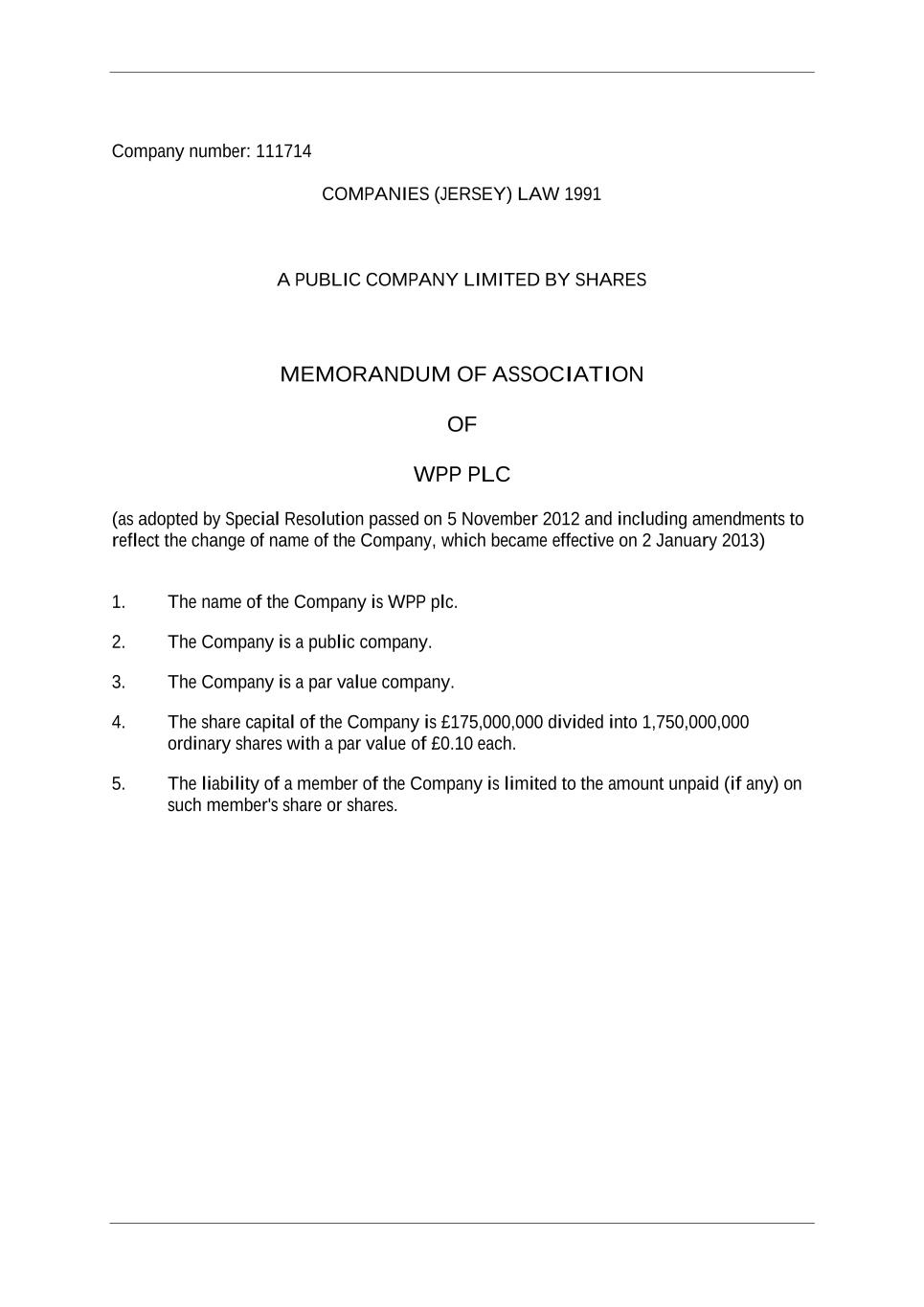 Company number: 111714 COMPANIES (JERSEY) LAW 1991 A PUBLIC COMPANY LIMITED BY SHARES MEMORANDUM OF ASSOCIATION OF WPP PLC (as adopted by Special Resolution passed on 5 November 2012 and including amendments to reflect the change of name of the Company, which became effective on 2 January 2013) 1. The name of the Company is WPP plc. 2. The Company is a public company. 3. The Company is a par value company. 4. The share capital of the Company is £175,000,000 divided into 1,750,000,000 ordinary shares with a par value of £0.10 each. 5. The liability of a member of the Company is limited to the amount unpaid (if any) on such member's share or shares.