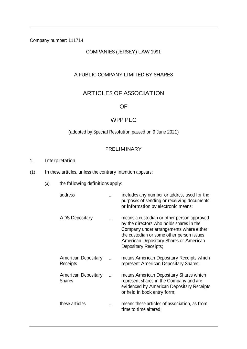 Company number: 111714 COMPANIES (JERSEY) LAW 1991 A PUBLIC COMPANY LIMITED BY SHARES ARTICLES OF ASSOCIATION OF WPP PLC (adopted by Special Resolution passed on 9 June 2021) PRELIMINARY 1. Interpretation (1) In these articles, unless the contrary intention appears: (a) the following definitions apply: address ... includes any number or address used for the purposes of sending or receiving documents or information by electronic means; ADS Depositary ... means a custodian or other person approved by the directors who holds shares in the Company under arrangements where either the custodian or some other person issues American Depositary Shares or American Depositary Receipts; American Depositary Receipts ... means American Depositary Receipts which represent American Depositary Shares; American Depositary Shares ... means American Depositary Shares which represent shares in the Company and are evidenced by American Depositary Receipts or held in book entry form; these articles ... means these articles of association, as from time to time altered;