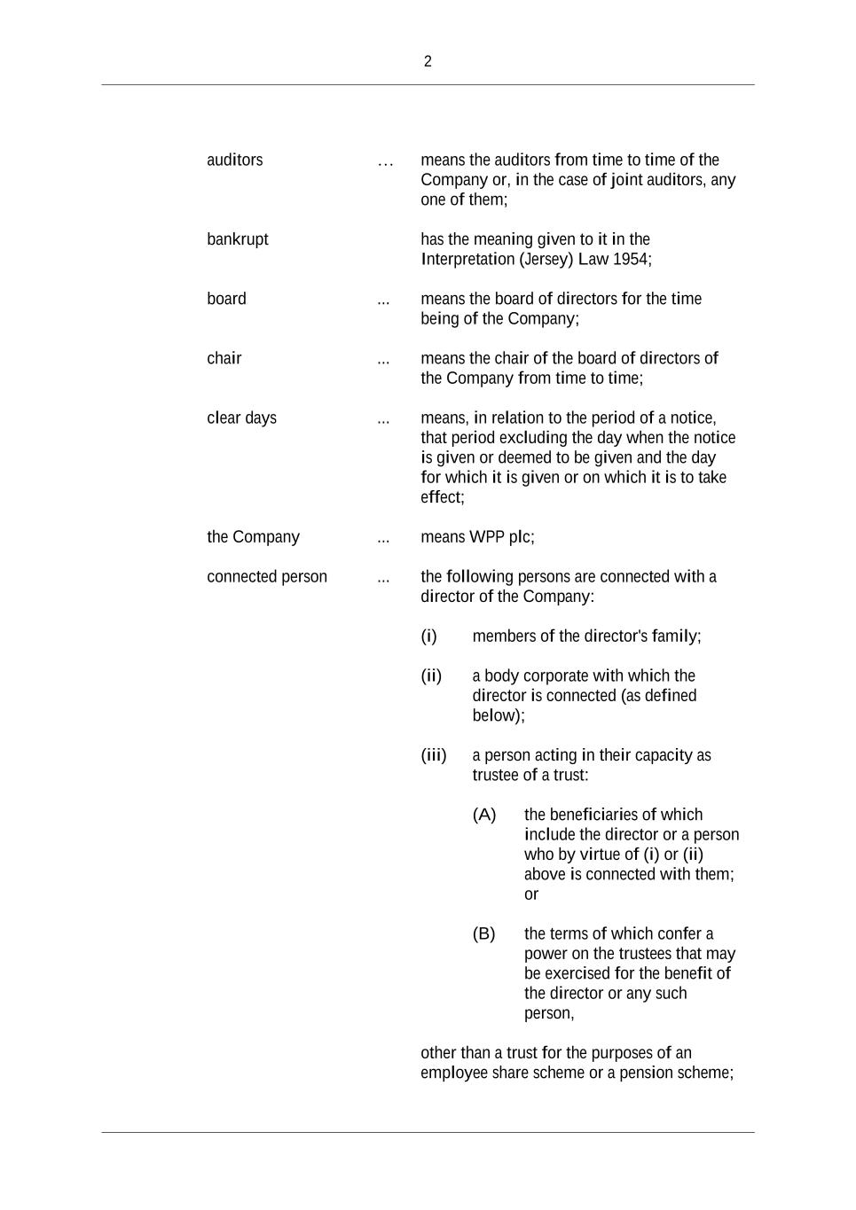 2 auditors … means the auditors from time to time of the Company or, in the case of joint auditors, any one of them; bankrupt has the meaning given to it in the Interpretation (Jersey) Law 1954; board ... means the board of directors for the time being of the Company; chair ... means the chair of the board of directors of the Company from time to time; clear days ... means, in relation to the period of a notice, that period excluding the day when the notice is given or deemed to be given and the day for which it is given or on which it is to take effect; the Company ... means WPP plc; connected person ... the following persons are connected with a director of the Company: (i) members of the director's family; (ii) a body corporate with which the director is connected (as defined below); (iii) a person acting in their capacity as trustee of a trust: (A) the beneficiaries of which include the director or a person who by virtue of (i) or (ii) above is connected with them; or (B) the terms of which confer a power on the trustees that may be exercised for the benefit of the director or any such person, other than a trust for the purposes of an employee share scheme or a pension scheme;