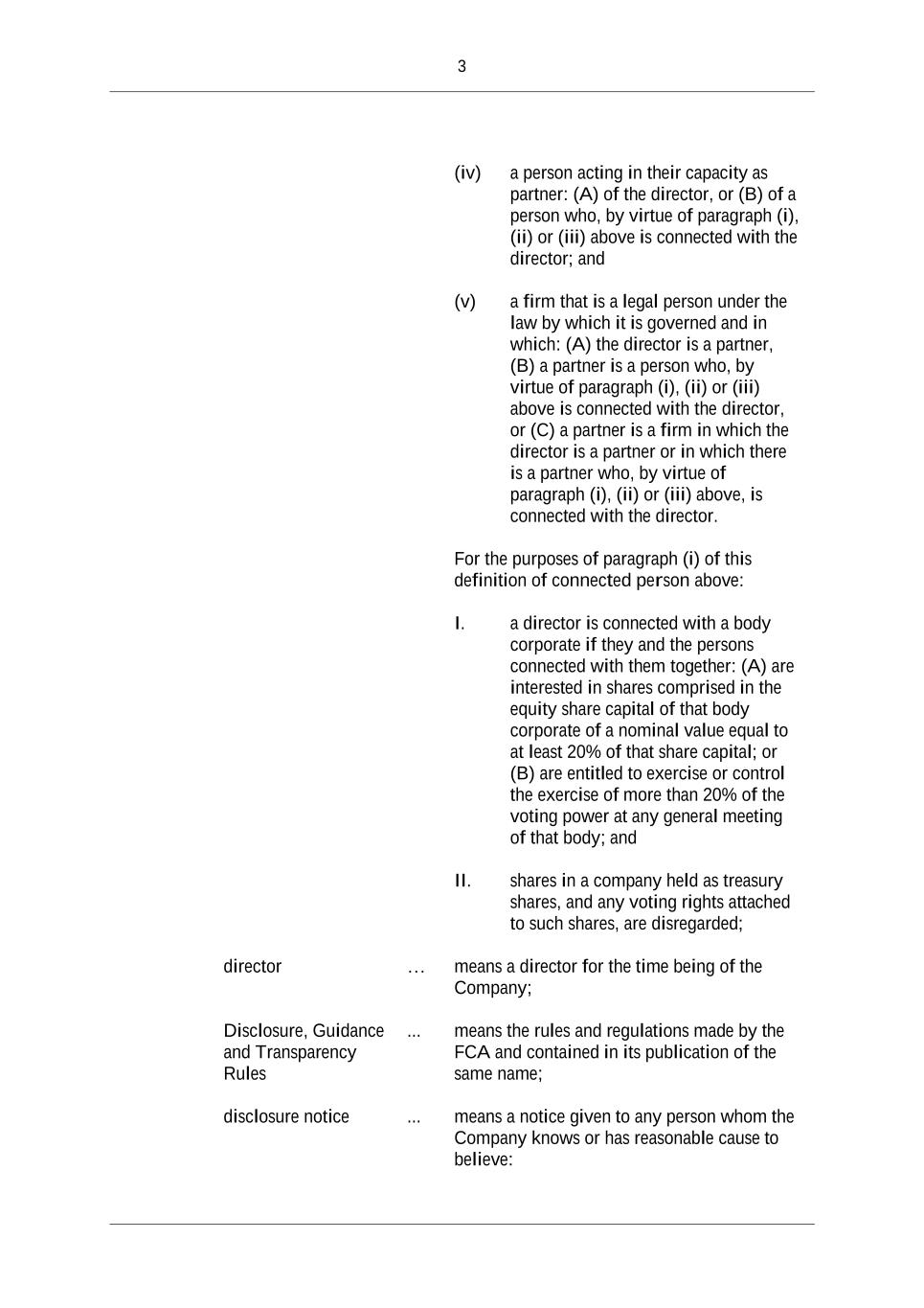 3 (iv) a person acting in their capacity as partner: (A) of the director, or (B) of a person who, by virtue of paragraph (i), (ii) or (iii) above is connected with the director; and (v) a firm that is a legal person under the law by which it is governed and in which: (A) the director is a partner, (B) a partner is a person who, by virtue of paragraph (i), (ii) or (iii) above is connected with the director, or (C) a partner is a firm in which the director is a partner or in which there is a partner who, by virtue of paragraph (i), (ii) or (iii) above, is connected with the director. For the purposes of paragraph (i) of this definition of connected person above: I. a director is connected with a body corporate if they and the persons connected with them together: (A) are interested in shares comprised in the equity share capital of that body corporate of a nominal value equal to at least 20% of that share capital; or (B) are entitled to exercise or control the exercise of more than 20% of the voting power at any general meeting of that body; and II. shares in a company held as treasury shares, and any voting rights attached to such shares, are disregarded; director … means a director for the time being of the Company; Disclosure, Guidance and Transparency Rules ... means the rules and regulations made by the FCA and contained in its publication of the same name; disclosure notice ... means a notice given to any person whom the Company knows or has reasonable cause to believe:
