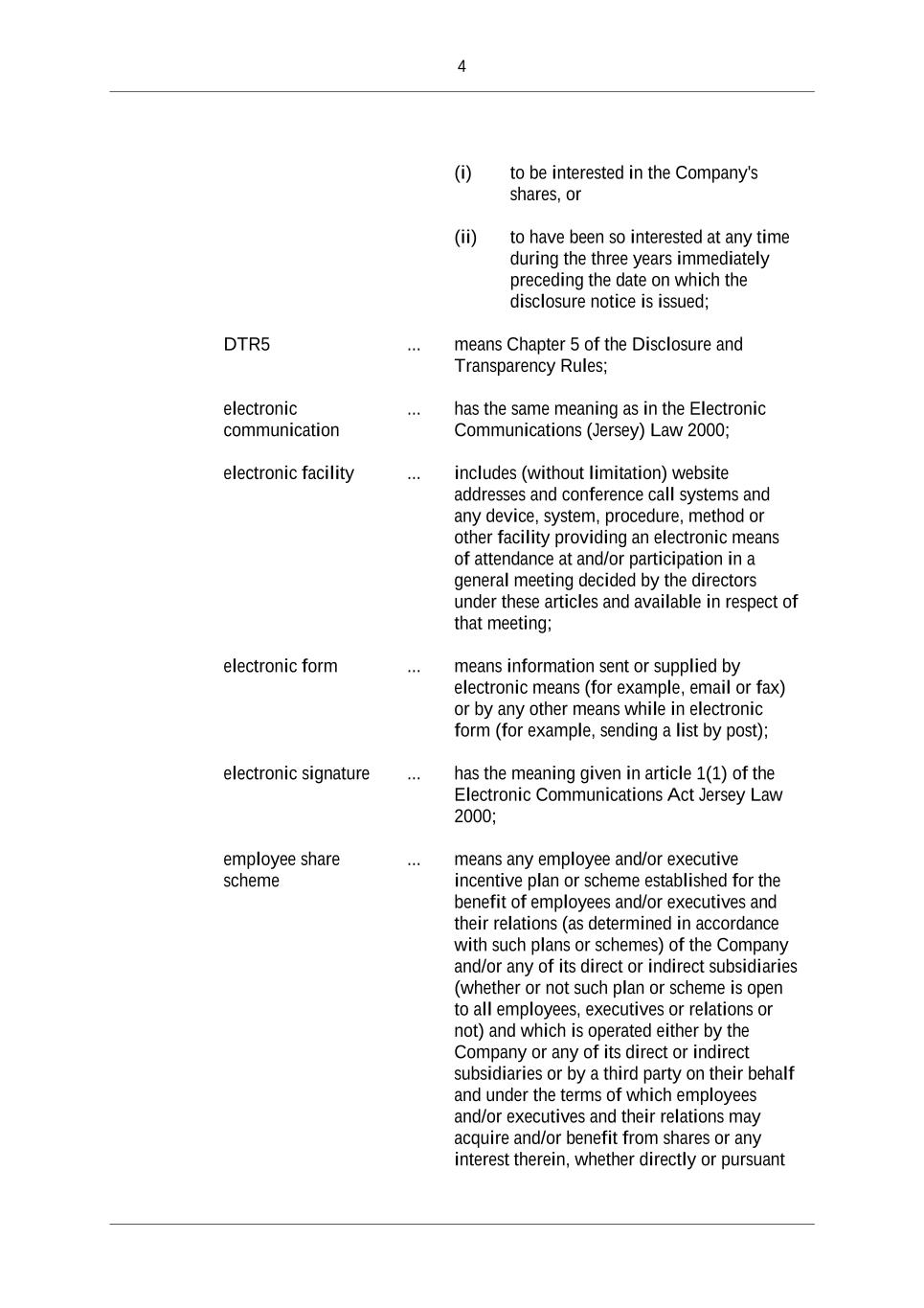 4 (i) to be interested in the Company's shares, or (ii) to have been so interested at any time during the three years immediately preceding the date on which the disclosure notice is issued; DTR5 ... means Chapter 5 of the Disclosure and Transparency Rules; electronic communication ... has the same meaning as in the Electronic Communications (Jersey) Law 2000; electronic facility ... includes (without limitation) website addresses and conference call systems and any device, system, procedure, method or other facility providing an electronic means of attendance at and/or participation in a general meeting decided by the directors under these articles and available in respect of that meeting; electronic form ... means information sent or supplied by electronic means (for example, email or fax) or by any other means while in electronic form (for example, sending a list by post); electronic signature ... has the meaning given in article 1(1) of the Electronic Communications Act Jersey Law 2000; employee share scheme ... means any employee and/or executive incentive plan or scheme established for the benefit of employees and/or executives and their relations (as determined in accordance with such plans or schemes) of the Company and/or any of its direct or indirect subsidiaries (whether or not such plan or scheme is open to all employees, executives or relations or not) and which is operated either by the Company or any of its direct or indirect subsidiaries or by a third party on their behalf and under the terms of which employees and/or executives and their relations may acquire and/or benefit from shares or any interest therein, whether directly or pursuant