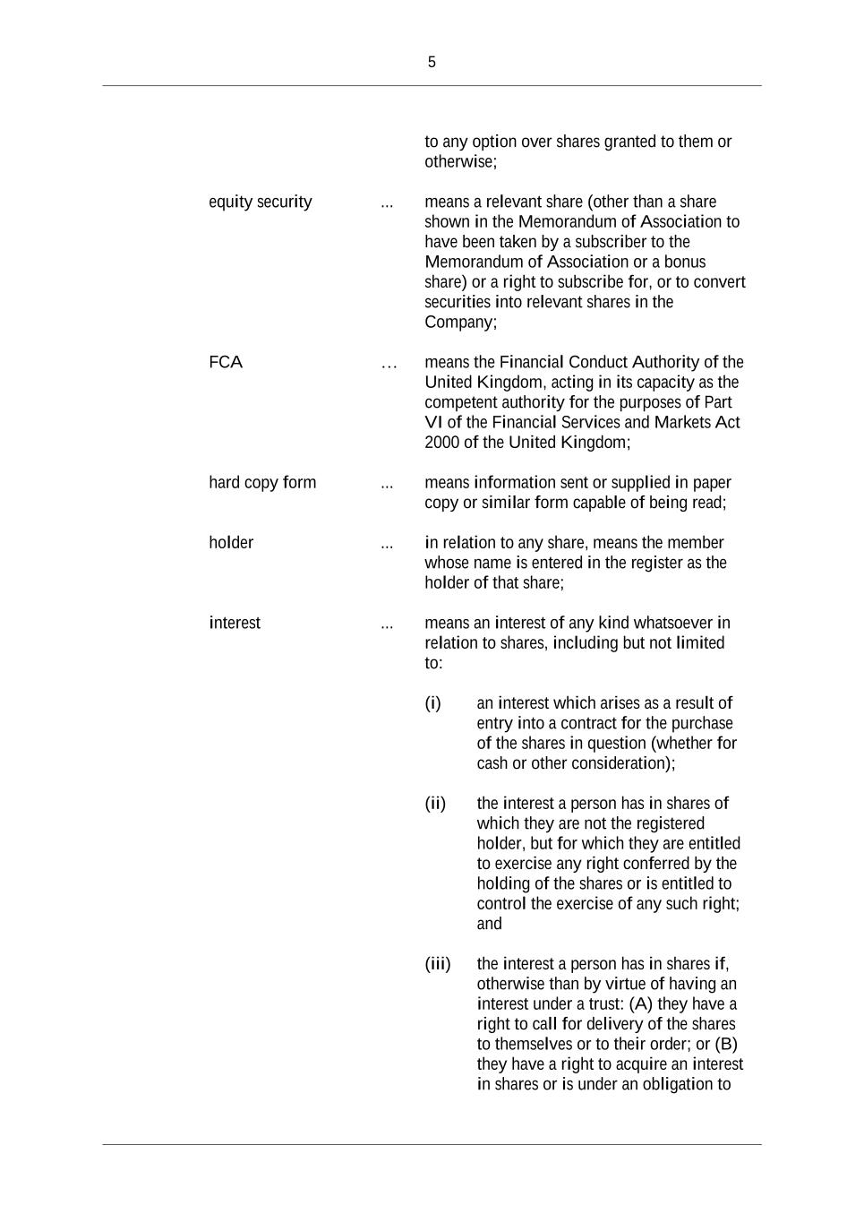 5 to any option over shares granted to them or otherwise; equity security ... means a relevant share (other than a share shown in the Memorandum of Association to have been taken by a subscriber to the Memorandum of Association or a bonus share) or a right to subscribe for, or to convert securities into relevant shares in the Company; FCA … means the Financial Conduct Authority of the United Kingdom, acting in its capacity as the competent authority for the purposes of Part VI of the Financial Services and Markets Act 2000 of the United Kingdom; hard copy form ... means information sent or supplied in paper copy or similar form capable of being read; holder ... in relation to any share, means the member whose name is entered in the register as the holder of that share; interest ... means an interest of any kind whatsoever in relation to shares, including but not limited to: (i) an interest which arises as a result of entry into a contract for the purchase of the shares in question (whether for cash or other consideration); (ii) the interest a person has in shares of which they are not the registered holder, but for which they are entitled to exercise any right conferred by the holding of the shares or is entitled to control the exercise of any such right; and (iii) the interest a person has in shares if, otherwise than by virtue of having an interest under a trust: (A) they have a right to call for delivery of the shares to themselves or to their order; or (B) they have a right to acquire an interest in shares or is under an obligation to