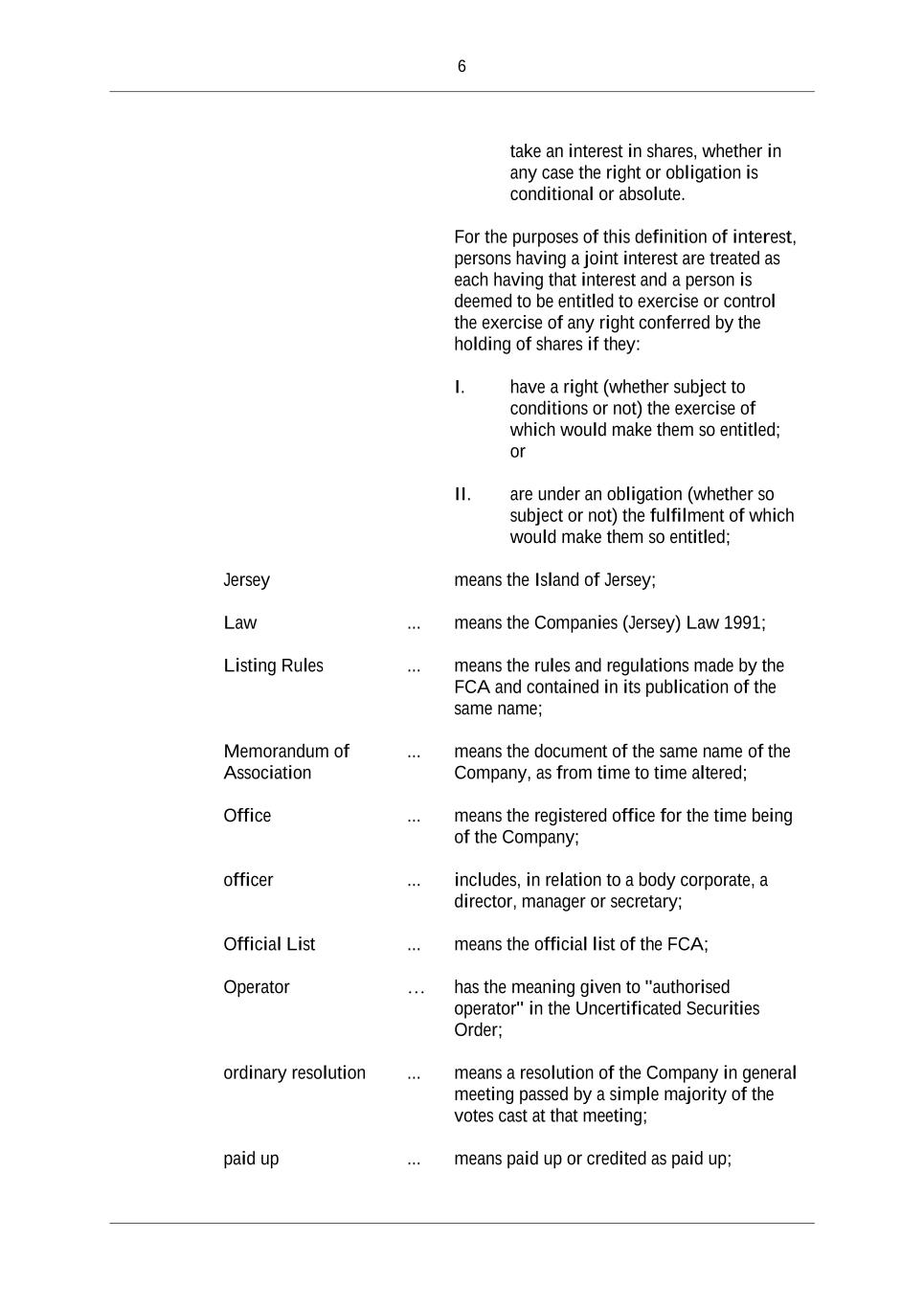 6 take an interest in shares, whether in any case the right or obligation is conditional or absolute. For the purposes of this definition of interest, persons having a joint interest are treated as each having that interest and a person is deemed to be entitled to exercise or control the exercise of any right conferred by the holding of shares if they: I. have a right (whether subject to conditions or not) the exercise of which would make them so entitled; or II. are under an obligation (whether so subject or not) the fulfilment of which would make them so entitled; Jersey means the Island of Jersey; Law ... means the Companies (Jersey) Law 1991; Listing Rules ... means the rules and regulations made by the FCA and contained in its publication of the same name; Memorandum of Association ... means the document of the same name of the Company, as from time to time altered; Office ... means the registered office for the time being of the Company; officer ... includes, in relation to a body corporate, a director, manager or secretary; Official List ... means the official list of the FCA; Operator … has the meaning given to "authorised operator" in the Uncertificated Securities Order; ordinary resolution ... means a resolution of the Company in general meeting passed by a simple majority of the votes cast at that meeting; paid up ... means paid up or credited as paid up;