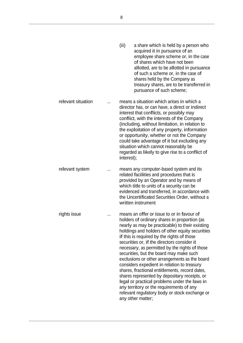 8 (ii) a share which is held by a person who acquired it in pursuance of an employee share scheme or, in the case of shares which have not been allotted, are to be allotted in pursuance of such a scheme or, in the case of shares held by the Company as treasury shares, are to be transferred in pursuance of such scheme; relevant situation ... means a situation which arises in which a director has, or can have, a direct or indirect interest that conflicts, or possibly may conflict, with the interests of the Company (including, without limitation, in relation to the exploitation of any property, information or opportunity, whether or not the Company could take advantage of it but excluding any situation which cannot reasonably be regarded as likely to give rise to a conflict of interest); relevant system ... means any computer-based system and its related facilities and procedures that is provided by an Operator and by means of which title to units of a security can be evidenced and transferred, in accordance with the Uncertificated Securities Order, without a written instrument rights issue ... means an offer or issue to or in favour of holders of ordinary shares in proportion (as nearly as may be practicable) to their existing holdings and holders of other equity securities if this is required by the rights of those securities or, if the directors consider it necessary, as permitted by the rights of those securities, but the board may make such exclusions or other arrangements as the board considers expedient in relation to treasury shares, fractional entitlements, record dates, shares represented by depositary receipts, or legal or practical problems under the laws in any territory or the requirements of any relevant regulatory body or stock exchange or any other matter;