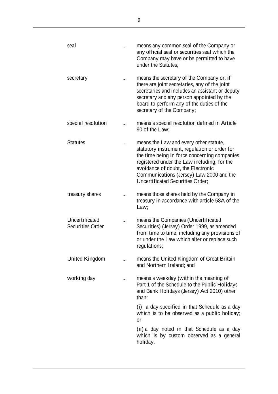 9 seal ... means any common seal of the Company or any official seal or securities seal which the Company may have or be permitted to have under the Statutes; secretary ... means the secretary of the Company or, if there are joint secretaries, any of the joint secretaries and includes an assistant or deputy secretary and any person appointed by the board to perform any of the duties of the secretary of the Company; special resolution ... means a special resolution defined in Article 90 of the Law; Statutes ... means the Law and every other statute, statutory instrument, regulation or order for the time being in force concerning companies registered under the Law including, for the avoidance of doubt, the Electronic Communications (Jersey) Law 2000 and the Uncertificated Securities Order; treasury shares ... means those shares held by the Company in treasury in accordance with article 58A of the Law; Uncertificated Securities Order ... means the Companies (Uncertificated Securities) (Jersey) Order 1999, as amended from time to time, including any provisions of or under the Law which alter or replace such regulations; United Kingdom ... means the United Kingdom of Great Britain and Northern Ireland; and working day ... means a weekday (within the meaning of Part 1 of the Schedule to the Public Holidays and Bank Holidays (Jersey) Act 2010) other than: (i) a day specified in that Schedule as a day which is to be observed as a public holiday; or (ii) a day noted in that Schedule as a day which is by custom observed as a general holiday.