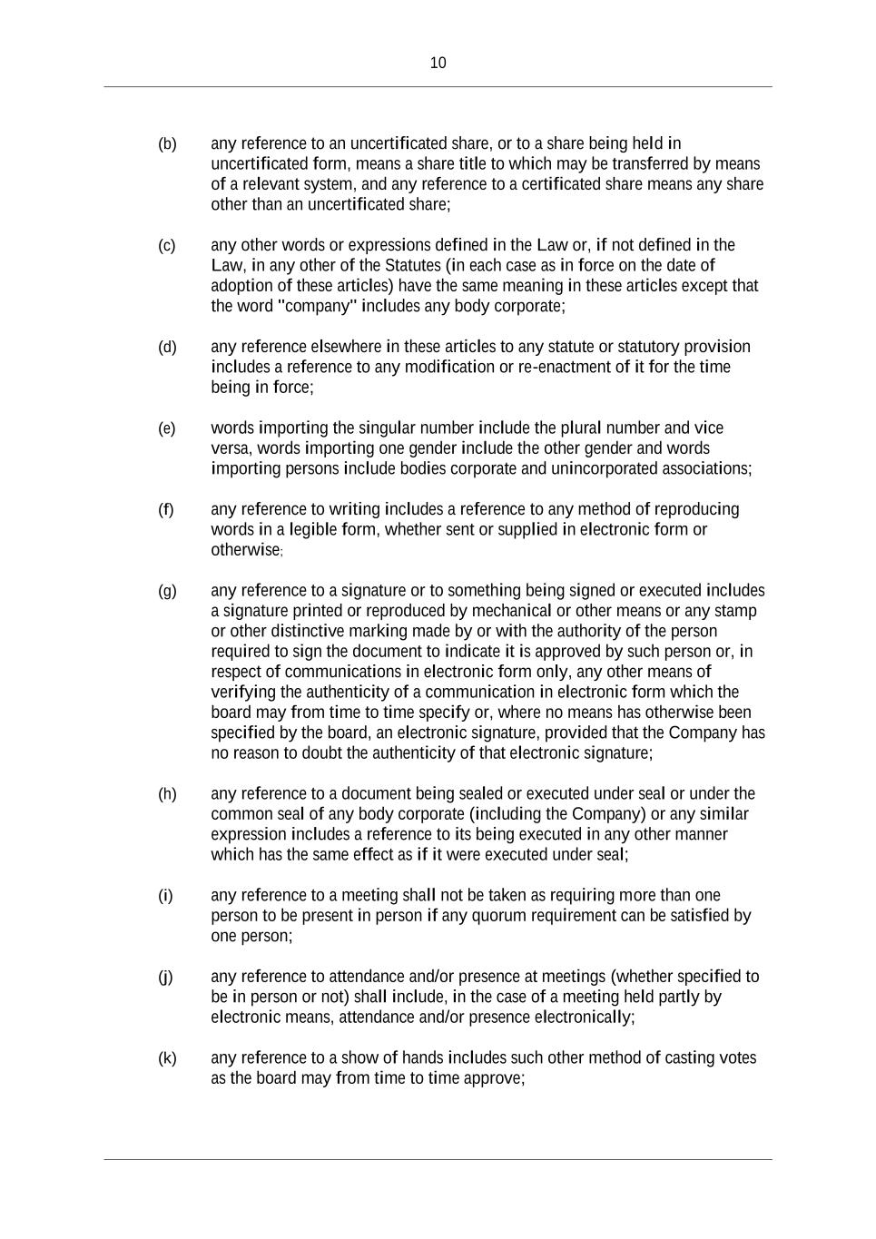 10 (b) any reference to an uncertificated share, or to a share being held in uncertificated form, means a share title to which may be transferred by means of a relevant system, and any reference to a certificated share means any share other than an uncertificated share; (c) any other words or expressions defined in the Law or, if not defined in the Law, in any other of the Statutes (in each case as in force on the date of adoption of these articles) have the same meaning in these articles except that the word "company" includes any body corporate; (d) any reference elsewhere in these articles to any statute or statutory provision includes a reference to any modification or re-enactment of it for the time being in force; (e) words importing the singular number include the plural number and vice versa, words importing one gender include the other gender and words importing persons include bodies corporate and unincorporated associations; (f) any reference to writing includes a reference to any method of reproducing words in a legible form, whether sent or supplied in electronic form or otherwise; (g) any reference to a signature or to something being signed or executed includes a signature printed or reproduced by mechanical or other means or any stamp or other distinctive marking made by or with the authority of the person required to sign the document to indicate it is approved by such person or, in respect of communications in electronic form only, any other means of verifying the authenticity of a communication in electronic form which the board may from time to time specify or, where no means has otherwise been specified by the board, an electronic signature, provided that the Company has no reason to doubt the authenticity of that electronic signature; (h) any reference to a document being sealed or executed under seal or under the common seal of any body corporate (including the Company) or any similar expression includes a reference to its being executed in any other manner which has the same effect as if it were executed under seal; (i) any reference to a meeting shall not be taken as requiring more than one person to be present in person if any quorum requirement can be satisfied by one person; (j) any reference to attendance and/or presence at meetings (whether specified to be in person or not) shall include, in the case of a meeting held partly by electronic means, attendance and/or presence electronically; (k) any reference to a show of hands includes such other method of casting votes as the board may from time to time approve;